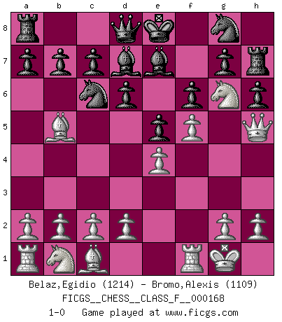 Last move : 1-0 2015 November 14 19:59:41 [Event "FICGS__CHESS__CLASS_F__000168"] [Site "FICGS"] [Date "2015.11.11"] [Round "1"] [White "Belaz,Egidio"] [Black "Bromo,Alexis"] [Result "1-0"] [WhiteElo "1214"] [BlackElo "1109"] 1.e4 e5 2.f4 d6 3.Nf3 Nc6 4.Bb5 Bd7 5.O-O h6 6.f5 f6 7.Nh4 Be7 8.Ng6 Rh7 9.Qh5 1-0 King's gambit Kingside Castling by player White (move 5) Player White won this chess game. Follow this game move after move (download)It is the aim of the modern school, not to treat every position according to one general law, but according to the principle inherent in the position. (Richard Reti) Ich rechne überhaupt nicht voraus. Ich gewinne auch so. (Robert James Fischer) Muchos jugadores de Ajedrez se sorprendían cuando después de la partida, Fischer explicaba con calma: 'Yo ya había analizado esta posibilidad' en una posición en la cual yo creía que no era posible de prever desde la apertura. (Mikhail Tal) Un footballeur joue avec ses pieds, parfois avec sa tête. Un joueur d'échecs ne joue qu'avec sa tête. Et quand il ne joue plus, il meurt. (Jacob Murray) Over-the-board chess is the favorite of mortals, correspondence chess is the favorite of the gods. (Eduard Dyckhoff)