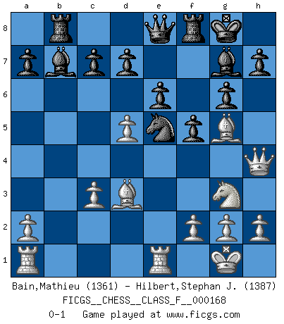 Last move : 0-1 2016 March 23 6:54:15 [Event "FICGS__CHESS__CLASS_F__000168"] [Site "FICGS"] [Date "2015.11.11"] [Round "1"] [White "Bain,Mathieu"] [Black "Hilbert,Stephan J."] [Result "0-1"] [WhiteElo "1361"] [BlackElo "1387"] 1.d4 b5 2.e4 Bb7 3.Nc3 b4 4.Nd5 e6 5.Nf4 Bxe4 6.Bd3 Bb7 7.c3 Nf6 8.Nge2 Nc6 9.O-O Be7 10.Ng3 O-O 11.Nfh5 Nxh5 12.Qxh5 g6 13.Qh6 f5 14.Bf4 Bf6 15.Rfe1 Bg7 16.Qg5 Bf6 17.Qh6 Qe8 18.Bg5 Bg7 19.Qh4 bxc3 20.bxc3 Rb8 21.d5 Ne5 0-1 This chess game has been lost on time (started : 2015.11.11 18:19:37) Polish defense Kingside Castling by player White (move 9) Kingside Castling by player Black (move 10) Player Black won this chess game. Follow this game move after move (download)Chess books should be used as we use glasses: to assist the sight, although some players make use of them as if they thought they conferred sight. (Jose Raul Capablanca) Im Reiche der Wirklichkeit ist man nie so glücklich wie im Reiche der Gedanken. (Arthur Schopenhauer) Siempre es mucho mejor sacrificar las piezas de tu oponente. (Savielly Tartakover) On croit qu'il y a plus de mauvais joueurs que de bons joueurs, c'est faux : Il y a autant de joueurs qui gagnent que de joueurs qui perdent. (Philippe Geluck) If you lose the game you should win the analysis! (Proverb)