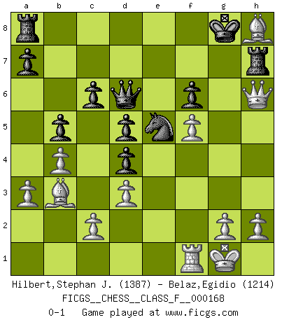 Last move : 0-1 2015 December 5 17:47:27 [Event "FICGS__CHESS__CLASS_F__000168"] [Site "FICGS"] [Date "2015.11.11"] [Round "1"] [White "Hilbert,Stephan J."] [Black "Belaz,Egidio"] [Result "0-1"] [WhiteElo "1387"] [BlackElo "1214"] 1.a3 e5 2.e4 Nf6 3.Nc3 Bc5 4.b4 Bd4 5.Bc4 O-O 6.Nf3 d6 7.Nxd4 exd4 8.Nd5 Nxe4 9.O-O b5 10.Bb3 Be6 11.d3 Nf6 12.Bg5 Nbd7 13.Qf3 Ne5 14.Qg3 Bxd5 15.Bxd5 c6 16.Bb3 Ng6 17.f4 Nh5 18.Qh3 Nf6 19.f5 Ne5 20.Rf4 d5 21.Rh4 Qd6 22.Bxf6 g6 23.Bh8 h5 24.Rxh5 gxh5 25.Qxh5 f6 26.Qh6 Rf7 27.Rf1 Rh7 0-1 Anderssen's Opening Kingside Castling by player Black (move 5) Kingside Castling by player White (move 9) Player Black won this chess game. Follow this game move after move (download)Pawns are born free, yet they are everywhere in chains. (Rick Kennedy) Habe Mut, dich deines eigenen Verstandes zu bedienen. (Immanuel Kant) Antes de los Finales, los dioses han colocado el Juego Medio. (Siegbert Tarrasch) A chaque perte on perd un peu de soi. (Joël Lautier) Computers are like Old Testament gods; lots of rules and no mercy. (Joseph Campbell)