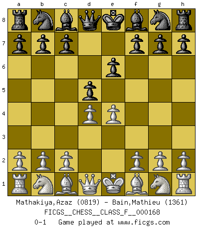 Last move : 0-1 2016 January 2 22:29:20 [Event "FICGS__CHESS__CLASS_F__000168"] [Site "FICGS"] [Date "2015.11.11"] [Round "1"] [White "Mathakiya,Azaz"] [Black "Bain,Mathieu"] [Result "0-1"] [WhiteElo "0819"] [BlackElo "1361"] 1.e4 e6 2.d4 d5 0-1 This chess game has been lost on time (started : 2015.11.11 18:19:37) French defense Player Black won this chess game. Follow this game move after move (download)A win by an unsound combination, however showy, fills me with artistic horror. (Wilhelm Steinitz) Kritik überlasse ich den Spießern. Ich zeige nichts, wofür ich mich schämen muss. (Alexandra Kosteniuk) El pensamiento metódico es mas útil en el Ajedrez que la inspiración. (C. J. S. Purdy) En blitz, le Cavalier l'emporte sur le Fou. (Vlastimil Hort) Success without honor is an unseasoned dish; it will satisfy your hunger, but it won't taste good. (Joe Paterno)