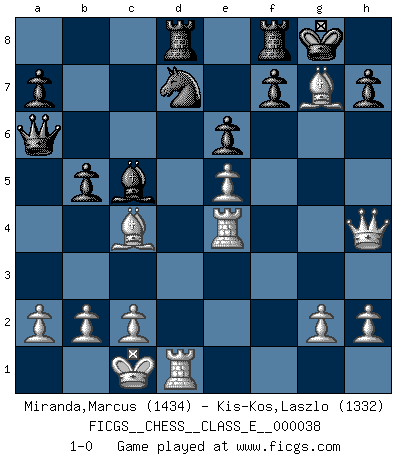 Last move : 1-0 2007 April 6 19:1:30 [Event "FICGS__CHESS__CLASS_E__000038"] [Site "FICGS"] [Date "2007.03.15"] [Round "1"] [White "Miranda,Marcus"] [Black "Kis-Kos,Laszlo"] [Result "1-0"] [WhiteElo "1434"] [BlackElo "1332"] 1.e4 c5 2.Nf3 d6 3.d4 cxd4 4.Nxd4 Nf6 5.Nc3 Nc6 6.Bg5 e6 7.Qd2 Be7 8.O-O-O O-O 9.f4 Nxd4 10.Qxd4 Qa5 11.Bc4 Bd7 12.e5 dxe5 13.fxe5 Bc6 14.Bd2 Bc5 15.Qh4 Nd7 16.Rhe1 b5 17.Ne4 Qa6 18.Bh6 Bxe4 19.Rxe4 Rad8 20.Bxg7 1-0 Sicilian : Richter-Rauzer, Rauzer attack, 7...Be7 Queenside Castling by player White (move 8) Kingside Castling by player Black (move 8) Player White won this chess game. Follow this game move after move (download)There just isn't enough televised Chess. (David Letterman) Wenn Du absolut nicht mehr weißt, was Du tun sollst, dann ist es Zeit für Panik. (John van der Wiel) El Ajedrez no es como la vida... ¡tiene reglas!. (Mark Pasternak) Si le désir cupide (et stupide) de gagner est une inépuisable source de souffrance, une combinaison brillante sur l'échiquier est une découverte : le coquelicot qui s'épanouit lorsque apparaît la Voie Lactée. (Arrabal) There is no vagueness without wind. (Chinese proverb)