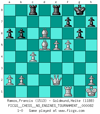 Last move : 1-0 2015 November 24 17:42:24 [Event "FICGS__CHESS__NO_ENGINES_TOURNAMENT__000082"] [Site "FICGS"] [Date "2015.11.12"] [Round "1"] [White "Ramos,Francis"] [Black "Goldmund,Heike"] [Result "1-0"] [WhiteElo "1513"] [BlackElo "1188"] 1.e4 d5 2.exd5 Qxd5 3.Nc3 Qa5 4.d4 Nf6 5.Nf3 Bf5 6.Bc4 e6 7.O-O c6 8.Ne5 Qc7 9.Bb3 Nbd7 10.Qe2 Bd6 11.f4 O-O 12.Kh1 c5 13.Nb5 Qb6 14.Nxd6 Qxd6 15.dxc5 Qxc5 16.Be3 Nxe5 17.Bxc5 Rfd8 18.fxe5 Nd5 19.Bd6 Rac8 20.Rxf5 exf5 21.Bxd5 b6 22.c4 a6 23.Rf1 g6 24.g4 Re8 25.gxf5 1-0 Scandinavian defense Kingside Castling by player White (move 7) Kingside Castling by player Black (move 11) Player White won this chess game. Follow this game move after move (download)Best by test: 1. e4 (Bobby Fischer) Sie führen leise Selbstgespräche, schlürfen lautstark ihre Getränke, schmatzen hörbar beim Essen, blasen ihrem Gegenüber Rauch in die Augen, niesen ihm ins Gesicht, starren ihn unverwandt an, bis er sich unter ihren Blicken windet, rutschen ständig auf ihrem Stuhl hin und her, rülpsen und bohren in der Nase. (Anonymous) El Jaque al descubierto es el bombardero del tablero. (Reuben Fine) C'est la seule position que je connaisse où les deux camps sont mals. Propos prêtés à V. Anand. The production of too many useful things results in too many useless people. (Karl Marx)