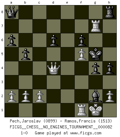 Last move : 1-0 2016 April 10 10:45:7 [Event "FICGS__CHESS__NO_ENGINES_TOURNAMENT__000082"] [Site "FICGS"] [Date "2015.11.12"] [Round "1"] [White "Pech,Jaroslav"] [Black "Ramos,Francis"] [Result "1-0"] [WhiteElo "0899"] [BlackElo "1513"] 1.e4 c5 2.Nf3 d6 3.d4 cxd4 4.Nxd4 Nf6 5.Nc3 a6 6.Be3 Ng4 7.Bg5 h6 8.Bh4 g5 9.Bg3 Bg7 10.Be2 h5 11.Bxg4 Bxg4 12.f3 Bd7 13.Bf2 Nc6 14.O-O g4 15.Nd5 Ne5 16.f4 Nc6 17.Nxc6 Bxc6 18.Bb6 Qc8 19.Nc7+ Kf8 20.Nxa8 Qxa8 21.Bd4 b5 22.Bxg7+ Kxg7 23.Qd4+ f6 24.Rae1 h4 25.e5 Bxg2 26.exf6+ exf6 27.Re7+ Kg6 28.f5+ Kg5 29.Rg7+ 1-0 Sicilian : Najdorf, Byrne (English) attack Kingside Castling by player White (move 14) Player White won this chess game. Follow this game move after move (download)A thorough understanding of the typical mating continuations makes the most complicated sacrificial combinations leading up to them not only not difficult, but almost a matter of course. (Siegbert Tarrasch) Die Partien sind immer verschieden, die Interviews immer die gleichen. (Garry Kasparov) El Ajedrez no es una pizca de inferior al violín, y tenemos un gran número de violinistas profesionales. (Mikhail Botvinnik) Ce qui caractérise les parties de combat, c'est que si le défenseur a constamment de difficiles problèmes à résoudre, l'attaquant doit chercher sans relâche de nouvelles possibilités d'attaque. (Koblentz) Employ the attack like tactic of defense. (Chinese proverb)