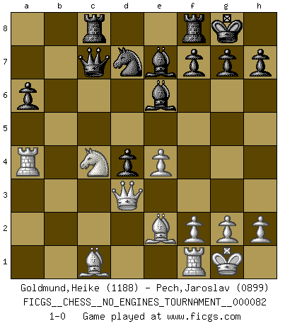 Last move : 1-0 2016 March 13 18:25:38 [Event "FICGS__CHESS__NO_ENGINES_TOURNAMENT__000082"] [Site "FICGS"] [Date "2015.11.12"] [Round "1"] [White "Goldmund,Heike"] [Black "Pech,Jaroslav"] [Result "1-0"] [WhiteElo "1188"] [BlackElo "0899"] 1.e4 c5 2.b4 cxb4 3.a3 e5 4.axb4 Bxb4 5.c3 Be7 6.Na3 Nf6 7.d3 d5 8.Nf3 Nc6 9.Qa4 O-O 10.Nb5 a6 11.Na3 Be6 12.Be2 b5 13.Qc2 dxe4 14.dxe4 Rc8 15.O-O Nd4 16.Nxd4 exd4 17.c4 bxc4 18.Nxc4 Qc7 19.Ra4 Nd7 20.Qd3 1-0 This chess game has been lost on time (started : 2015.11.12 16:1:40) Sicilian : wing gambit, Marshall variation Kingside Castling by player Black (move 9) Kingside Castling by player White (move 15) Player White won this chess game. Follow this game move after move (download)If you aren't afraid of Spassky, then I have removed the element of money. (Jim Slater) Schach verlangt totale Konzentration. (Robert James Fischer) ¿Se han dado cuenta de que Fischer casi nunca ha tenido piezas malas? El las intercambia y las piezas malas se quedan con sus oponenets. (Yuri Balashov) Le jeu d'échecs fait naître et fortifie en nous plusieurs qualités précieuses dans le cours de l'existence, telles que la prévoyance, la circonspection, la prudence, et la persévérance. (Benjamin Franklin - 1783, la morale des échecs) When you stop learning you start dying. (Scott Adams)