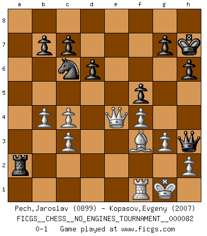 Last move : 0-1 2016 June 19 23:20:5 [Event "FICGS__CHESS__NO_ENGINES_TOURNAMENT__000082"] [Site "FICGS"] [Date "2015.11.12"] [Round "1"] [White "Pech,Jaroslav"] [Black "Kopasov,Evgeny"] [Result "0-1"] [WhiteElo "0899"] [BlackElo "2007"] 1.c4 Nf6 2.Nc3 e5 3.Nf3 Nc6 4.g3 Bb4 5.Bg2 O-O 6.O-O e4 7.Ne1 Bxc3 8.dxc3 h6 9.Nc2 Re8 10.Ne3 d6 11.Qc2 a5 12.Bd2 Qe7 13.f4 exf3 14.exf3 Qe5 15.Rae1 Qc5 16.Kh1 Bd7 17.f4 a4 18.b4 axb3 19.axb3 Qh5 20.b4 Bh3 21.Bf3 Ng4 22.Kg1 Rxe3 23.Bxe3 Bxf1 24.Rxf1 Nxe3 25.Qe2 Qh3 26.Qxe3 Ra2 27.Qe8+ Kh7 28.Qe4+ f5 0-1 This chess game has been lost on time (started : 2015.11.12 16:1:40) English Opening Kingside Castling by player Black (move 5) Kingside Castling by player White (move 6) Player Black won this chess game. Follow this game move after move (download)Daring ideas are like Chess men moved forward. They may be beaten, but they may start a winning game. (Johann Wolfgang von Goethe) Nur ein wirklich starker Spieler weiß wie schwach er spielt. (Savielly Grigorievitsch Tartakower) El Ajedrez es parte de la cultura, y si una cultura esta en decadencia, entonces también el Ajedrez declinará. (Mikhail Botvinnik) Plusieurs personnes se sont demandées comment Tal faisait pour gagner... En fait, c'est très simple ! Il met ses pièces au centre de l'échiquier et les sacrifie quelque part ! (David Bronstein) See no evil, hear no evil, speak no evil. (The 3 monkeys)