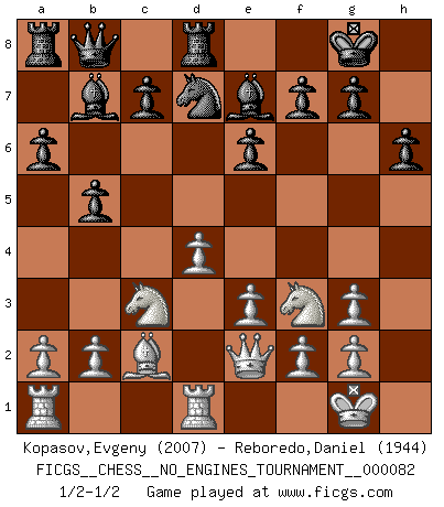 Last move : 1/2-1/2 2015 November 27 14:26:43 [Event "FICGS__CHESS__NO_ENGINES_TOURNAMENT__000082"] [Site "FICGS"] [Date "2015.11.12"] [Round "1"] [White "Kopasov,Evgeny"] [Black "Reboredo,Daniel"] [Result "1/2-1/2"] [WhiteElo "2007"] [BlackElo "1944"] 1.d4 d5 2.c4 e6 3.Nc3 Nf6 4.Bg5 Be7 5.e3 O-O 6.Nf3 h6 7.Bh4 b6 8.Be2 dxc4 9.Bxc4 Bb7 10.O-O Nbd7 11.Qe2 Ne4 12.Bg3 Nxg3 13.hxg3 a6 14.Rfd1 b5 15.Bd3 Qb8 16.Bc2 Rd8 1/2-1/2 QGD : Tartakower (Makagonov-Bondarevsky) system Kingside Castling by player Black (move 5) Kingside Castling by player White (move 10) This chess game ended in a draw. Follow this game move after move (download)You know you're going to lose. Even when I was ahead I knew I was going to lose. - On playing against Fischer. (Andrew Soltis) Privat ist Kortschnoi kein schlechter Mensch, sehr sympathisch. Aber während des Spiels ist er grausam. Er will dich töten. (Miguel Najdorf) Una victoria por una combinación errónea, aunque sea espectacular, me llena de horror artístico. (Wilhelm Steinitz) Echiquier : carré parfait, comme la Jérusalem nouvelle décrite par l'auteur de l'Apocalypse, huit cases sur huit, exaltation du chiffre 4, symbole du cosmos aux quatre horizons... où le noir et le blanc, l'ombre et la lumière, le mal et le bien s'entremêlent et se conjuguent. (Robert Couffignal, Le Gambit du poète) The modern world has divided itself into Conservatives and Progressives. The business of Progressives is to go on making mistakes. The business of the Conservatives is to prevent the mistakes from being corrected. (G.K. Chesterton)