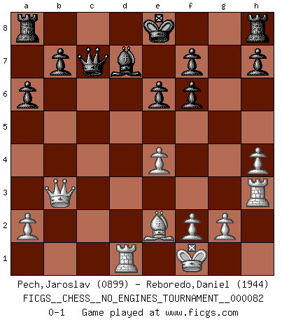 Last move : 0-1 2016 April 2 8:45:34 [Event "FICGS__CHESS__NO_ENGINES_TOURNAMENT__000082"] [Site "FICGS"] [Date "2015.11.12"] [Round "1"] [White "Pech,Jaroslav"] [Black "Reboredo,Daniel"] [Result "0-1"] [WhiteElo "0899"] [BlackElo "1944"] 1.d4 d5 2.c4 e6 3.Nc3 Nf6 4.Nf3 Bb4 5.Bg5 dxc4 6.e4 c5 7.Bxc4 cxd4 8.Nxd4 Bxc3+ 9.bxc3 Qa5 10.Bb5+ Nbd7 11.Bxf6 Qxc3+ 12.Kf1 gxf6 13.h4 a6 14.Rh3 Qa5 15.Be2 Nc5 16.Nb3 Nxb3 17.Qxb3 Qc7 18.Rd1 Bd7 0-1 This chess game has been lost on time (started : 2015.11.12 16:1:40) QGD : Ragozin, Vienna variation Player Black won this chess game. Follow this game move after move (download)A Chess game is divided into three stages: the first, when you hope you have the advantage, the second when you believe you have an advantage, and the third... when you know you're going to lose ! (Savielly Tartakower) Konzentriere dich auf materielle Gewinne. Nimm, was dir dein Gegner gibt, ausser es gibt einen guten Grund der dagegenspricht. (Robert James Fischer) Algunos sacrificios son sólidos, los demás son míos. (Mikhail Tal) L'attaque fait le spectacle, la défense gagne les matchs. (Dicton footballistique) Big Chess is a place for big hallucinations. (Thibault de Vassal)