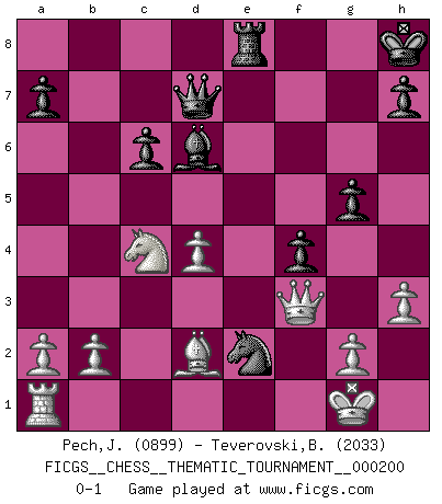 Last move : 0-1 2016 June 23 11:26:57 [Event "FICGS__CHESS__THEMATIC_TOURNAMENT__000200"] [Site "FICGS"] [Date "2015.11.15"] [Round "1"] [White "Pech,Jaroslav"] [Black "Teverovski,Bogoljub"] [Result "0-1"] [WhiteElo "0899"] [BlackElo "2033"] 1.e4 e5 2.f4 d5 3.exd5 exf4 4.Nf3 Nf6 5.Bb5+ c6 6.dxc6 Nxc6 7.d4 Bd6 8.Qe2+ Be6 9.Ng5 O-O 10.Nxe6 fxe6 11.Bxc6 bxc6 12.O-O Qc7 13.Qxe6+ Kh8 14.Qh3 g5 15.Nd2 Rae8 16.Nc4 Re2 17.Qf3 Rfe8 18.h3 Rxc2 19.Qd3 Rce2 20.Bd2 Nh5 21.Qf3 Ng3 22.Rfe1 Qd7 23.Rxe2 Nxe2+ 0-1 This chess game has been lost on time (started : 2015.11.15 0:18:30) KGD : Falkbeer counter-gambit Kingside Castling by player Black (move 9) Kingside Castling by player White (move 12) Player Black won this chess game. Follow this game move after move (download)When you are lonely, when you feel yourself an alien in the world, play Chess. This will raise your spirits and be your counselor in war. (Aristotle) Alles was am Schachbrett zählt sind gute Züge. (Robert James Fischer) Es muy difícil jugar en contra de la teoría de Einstein. - en su primera derrota en contra de Fischer (Mikhail Tal) Les Echecs mettent en conflit, non pas deux intelligences, mais deux volontés. (Lasker) The existence of forgetting has never been proved: We only know that some things don't come to mind when we want them. (Friedrich Nietzsche)
