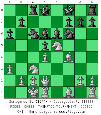 Last move : 0-1 2016 March 16 18:34:56 [Event "FICGS__CHESS__THEMATIC_TOURNAMENT__000200"] [Site "FICGS"] [Date "2015.11.15"] [Round "1"] [White "Zemlyanov,Sergey"] [Black "Duttagupta,Aniruddha"] [Result "0-1"] [WhiteElo "1744"] [BlackElo "1889"] 1.e4 e5 2.f4 d5 3.exd5 exf4 4.Nf3 c6 5.Nc3 Bd6 6.d4 Nf6 7.Qe2+ Kf8 8.Ne5 cxd5 9.Bxf4 Nc6 10.O-O-O Be6 11.a3 Rc8 12.Qd2 a6 0-1 This chess game has been lost on time (started : 2015.11.15 0:18:30) KGD : Falkbeer counter-gambit Queenside Castling by player White (move 10) Player Black won this chess game. Follow this game move after move (download)War is the child of passion, passion is the child of narcissism and narcissism is the child. (...) Another game ? (Thibault de Vassal) Meine Liebe ist Schach, Schach, Schach. Ich muss jeden Tag Schach spielen, deshalb fühle ich mich so stark. (Miguel Najdorf) No soy una persona materialista y por eso, no resiento la falta o pérdida del dinero. La ausencia de cosas mundanas carece de importancia. Ya que el Ajedrez es una forma en la que puedo ser tan materialista como yo desee sin tener la necesidad de vender mi alma. (Jamie Walter Adams) L'attaque fait le spectacle, la défense gagne les matchs. (Dicton footballistique) The project of the man are lower than those of the sky. (Chinese proverb)