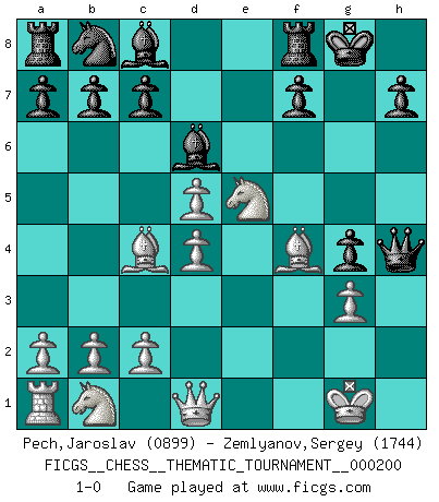 Last move : 1-0 2016 June 3 9:46:50 [Event "FICGS__CHESS__THEMATIC_TOURNAMENT__000200"] [Site "FICGS"] [Date "2015.11.15"] [Round "1"] [White "Pech,Jaroslav"] [Black "Zemlyanov,Sergey"] [Result "1-0"] [WhiteElo "0899"] [BlackElo "1744"] 1.e4 e5 2.f4 exf4 3.Nf3 g5 4.h4 g4 5.Ne5 Nf6 6.Bc4 d5 7.exd5 Bd6 8.d4 Nh5 9.O-O O-O 10.Rxf4 Nxf4 11.Bxf4 Qxh4 12.g3 1-0 This chess game has been lost on time (started : 2015.11.15 0:18:30) KGA : Kieseritsky, Berlin defense, 6.Bc4 Kingside Castling by player White (move 9) Kingside Castling by player Black (move 9) Player White won this chess game. Follow this game move after move (download)Fischer prefers to enter Chess history alone. (Miguel Najdorf) Am wohlsten fühle ich mich, wenn ich sehe, wie sich mein Gegner im Todeskampf windet. (Robert James Fischer) Uno por uno, yo los acribillé, mi superioridad muy pronto se volvio aparente. (Jose Capablanca) Avant la finale, les dieux ont créé le milieu de partie. (Tarrasch) The worth of a book is to be measured by what you can carry away from it. (James Bryce)