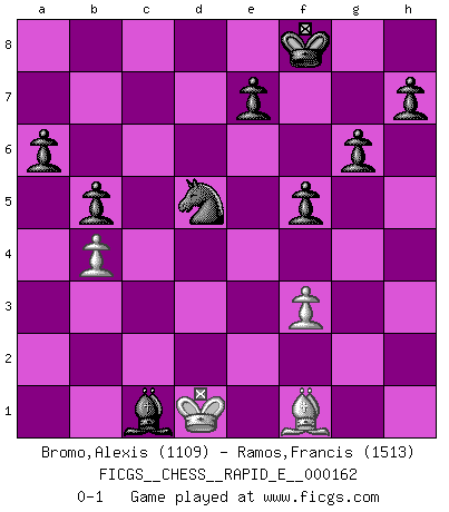 Last move : 0-1 2015 December 6 11:37:59 [Event "FICGS__CHESS__RAPID_E__000162"] [Site "FICGS"] [Date "2015.11.15"] [Round "1"] [White "Bromo,Alexis"] [Black "Ramos,Francis"] [Result "0-1"] [WhiteElo "1109"] [BlackElo "1513"] 1.d4 Nf6 2.c4 g6 3.Nc3 Bg7 4.Nf3 O-O 5.e3 d5 6.h3 b6 7.Be2 Bb7 8.O-O Nbd7 9.b3 Rc8 10.Bb2 dxc4 11.Bxc4 c5 12.dxc5 Nxc5 13.Qxd8 Rfxd8 14.Rad1 Bxf3 15.gxf3 a6 16.Rxd8+ Rxd8 17.Rd1 Rxd1+ 18.Nxd1 b5 19.Ba3 Nfd7 20.Be2 Kf8 21.b4 Na4 22.f4 Ndb6 23.e4 Bd4 24.Ne3 Nc3 25.Kf1 Nxa2 26.e5 Nc3 27.Bd3 Ncd5 28.Nxd5 Nxd5 29.Ke2 Nxf4+ 30.Kd2 Nxh3 31.f3 Bxe5 32.Ke3 f5 33.Bf1 Nf4 34.Bc1 Nd5+ 35.Kd2 Bf4+ 36.Kd1 Bxc1 0-1 King's Indian defense, 3.Nc3 Kingside Castling by player Black (move 4) Kingside Castling by player White (move 8) Player Black won this chess game. Follow this game move after move (download)I like to say that Bobby Fischer was the greatest player ever. But what made Fischer a genius was his ability to blend an American freshness and pragmatism with Russian ideas about strategy. (Bruce Pandolfini) Im Schach gibt es keinen Platz für Galanterie. (Irving Chernev) Un buen jugador siempre tiene buena suerte. (José Raúl Capablanca) Des idées, des idées, j'en ai cent, j'en ai mille. Des bonnes, des mauvaises, applicables, irréalisables... Il suffit de faire le tri ! (Roos) The right perception of any matter and a misunderstanding of the same matter do not wholly exclude each other. (Kafka's the trial)