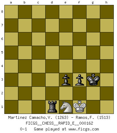 Last move : 0-1 2016 January 30 6:30:49 [Event "FICGS__CHESS__RAPID_E__000162"] [Site "FICGS"] [Date "2015.11.15"] [Round "1"] [White "Martinez Camacho,Victor Hugo"] [Black "Ramos,Francis"] [Result "0-1"] [WhiteElo "1263"] [BlackElo "1513"] 1.e4 c5 2.Nc3 d6 3.Nf3 Nf6 4.Bc4 e6 5.O-O Be7 6.d3 O-O 7.Bg5 a6 8.a4 Nc6 9.Qd2 Qc7 10.Rfe1 Ne5 11.Nxe5 dxe5 12.Re2 Re8 13.h3 Bd7 14.Re3 Rab8 15.Ne2 b5 16.axb5 axb5 17.Bb3 Bc6 18.Ng3 h6 19.Bxf6 Bxf6 20.Nf1 Bg5 21.Nh2 Red8 22.Qe2 Bxe3 23.Qxe3 Be8 24.Qe1 c4 25.dxc4 bxc4 26.Ba2 Rxb2 27.Qc3 Rb6 28.Qxc4 Qxc4 29.Bxc4 Rb4 30.Bd3 Bb5 31.Bxb5 Rxb5 32.Nf3 Rc8 33.Ra2 g5 34.Kh2 Rc4 35.Nd2 Rd4 36.Ra8+ Kg7 37.Nf3 Rxe4 38.Rc8 Ra4 39.c4 Rba5 40.c5 Kf6 41.c6 Rc5 42.c7 Rac4 43.Nd2 Rxc7 44.Rh8 Kg7 45.Nxc4 Kxh8 46.Nxe5 f5 47.g3 Kg7 48.Kg2 Kf6 49.Nf3 e5 50.h4 Rc3 51.Nd2 e4 52.hxg5+ hxg5 53.Nb1 Rc2 54.Na3 Ra2 55.Nc4 Ke6 56.Nb6 e3 57.Nc4 Rxf2+ 58.Kg1 f4 59.gxf4 gxf4 60.Na5 Kf5 61.Nc4 Kg4 62.Ne5+ Kg3 63.Nd3 Rd2 64.Ne1 Rd1 65.Kf1 f3 0-1 Sicilian : Closed Kingside Castling by player White (move 5) Kingside Castling by player Black (move 6) 10 pieces endgame at move 52 : White KNPPP , Black KRPPP WHITE : King + 1 Knight 3 Pawns BLACK : King + 1 Rook 3 Pawns 9 pieces endgame at move 52 : White KNPP , Black KRPPP WHITE : King + 1 Knight 2 Pawns BLACK : King + 1 Rook 3 Pawns 8 pieces endgame at move 57 : White KNP , Black KRPPP WHITE : King + 1 Knight 1 Pawn BLACK : King + 1 Rook 3 Pawns 7 pieces endgame at move 59 : White KNP , Black KRPP WHITE : King + 1 Knight 1 Pawn BLACK : King + 1 Rook 2 Pawns 6 pieces endgame at move 59 : White KN , Black KRPP WHITE : King + 1 Knight BLACK : King + 1 Rook 2 Pawns Player Black won this chess game. Follow this game move after move (download)When I have White, I win because I am white; When I have Black, I win because I am Bogolyubov. (Bogolyubov) Schach sollte überall auf der Welt Schulfach werden. Es fördert die geistige Auseinandersetzung. Es lehrt die Demut in der Niederlage. (Garry Kasparov) Cuando estes solo, cuando te sientas un extraño en el mundo, juega al Ajedrez. Esto levantará tu espiritu y será tu consejero de guerra. (Aristóteles) C'est la seule position que je connaisse où les deux camps sont mals. Propos prêtés à V. Anand. If passion drives you, let reason holds the reins. (Benjamin Franklin)