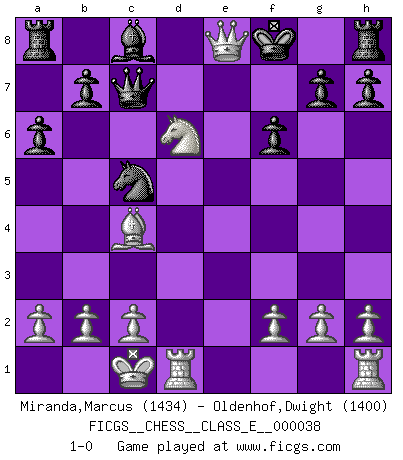 Last move : 1-0 2007 March 20 21:34:16 [Event "FICGS__CHESS__CLASS_E__000038"] [Site "FICGS"] [Date "2007.03.15"] [Round "1"] [White "Miranda,Marcus"] [Black "Oldenhof,Dwight"] [Result "1-0"] [WhiteElo "1434"] [BlackElo "1400"] 1.e4 e5 2.Nf3 Bc5 3.Nc3 d6 4.Na4 Nd7 5.Nxc5 Nxc5 6.d4 exd4 7.Qxd4 Nf6 8.e5 Ne6 9.Qa4+ Nd7 10.exd6 cxd6 11.Be3 a6 12.O-O-O Qc7 13.Nd4 Nec5 14.Nb5 Qc6 15.Bxc5 Nxc5 16.Nxd6+ Ke7 17.Qh4+ f6 18.Bc4 Kf8 19.Qh5 Qc7 20.Qe8+ 1-0 King's knight Opening Queenside Castling by player White (move 12) Player White won this chess game. Follow this game move after move (download)Best by test: 1. e4 (Bobby Fischer) Fischer machte Schach einfach zu einer aufregenden Sache, wann immer er sich ans Brett setzte. (Raymond Keene) Todo se encuentra en un estado de flujo y esto incluye al mundo del Ajedrez. (Mikhail Botvinnik) RxDa4 pat (...) If we don't succeed, we run the risk of failure. (George W. Bush)