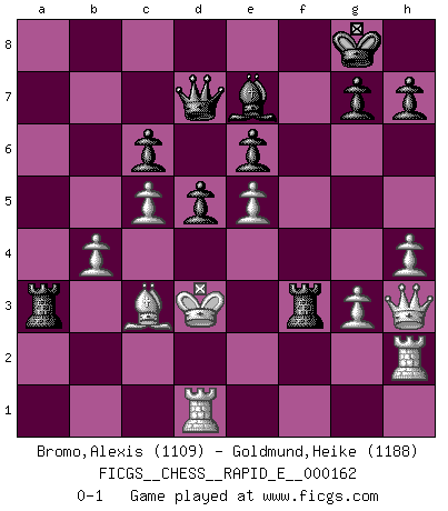 Last move : 0-1 2015 December 3 6:29:39 [Event "FICGS__CHESS__RAPID_E__000162"] [Site "FICGS"] [Date "2015.11.15"] [Round "1"] [White "Bromo,Alexis"] [Black "Goldmund,Heike"] [Result "0-1"] [WhiteElo "1109"] [BlackElo "1188"] 1.d4 d5 2.c4 Nf6 3.Nc3 c6 4.h3 Bf5 5.Nf3 Nbd7 6.a3 Ne4 7.Nxe4 Bxe4 8.e3 Nf6 9.c5 e6 10.b4 Be7 11.Bb2 O-O 12.Bd3 Qc7 13.Bxe4 Nxe4 14.Ne5 Bh4 15.g3 Bg5 16.h4 Be7 17.Qg4 Nf6 18.Qf3 Ne4 19.Qg2 f6 20.f3 fxe5 21.fxe4 exd4 22.exd4 Rae8 23.e5 Rb8 24.O-O-O b6 25.Rh2 bxc5 26.dxc5 a5 27.Bc3 axb4 28.axb4 Ra8 29.Kc2 Ra3 30.Qh3 Qd7 31.Kd3 Rf3+ 0-1 QGD : Marshall defense Kingside Castling by player Black (move 11) Queenside Castling by player White (move 24) Player Black won this chess game. Follow this game move after move (download)A man without frontiers. He didn't divide the East and the West, he brought them together in their admiration for him. (Ljubomir Ljubojevic, about Bobby Fischer's death) Wie, soll nun auch die Opposition abgeschafft werden? Ja, es tut mir leid, Ihnen diesen Schmerz nicht ersparen zu können. (Aaron Nimzowitsch) Solo el jugador con la iniciativa tiene el derecho a atacar. (Wilhelm Steinitz) J'ai vu le vaincu d'Echecs jouer des années durant dans l'espoir de la fête de la victoire. Car tu es plus riche de ce qu'elle existe si même elle n'est point pour toi. Ainsi de la perle du fond des mers. (Antoine de Saint-Exupéry) Mac users swear by their computers. PC users swear at their computers. (Author unknown)