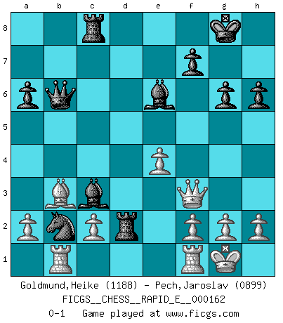Last move : 0-1 2016 January 23 13:10:18 [Event "FICGS__CHESS__RAPID_E__000162"] [Site "FICGS"] [Date "2015.11.15"] [Round "1"] [White "Goldmund,Heike"] [Black "Pech,Jaroslav"] [Result "0-1"] [WhiteElo "1188"] [BlackElo "0899"] 1.e4 d6 2.d4 Nf6 3.Nc3 g6 4.Bg5 Bg7 5.Nf3 h6 6.Be3 Ng4 7.Bf4 Nc6 8.Bc4 O-O 9.O-O Nxd4 10.Nxd4 e5 11.Bxe5 Nxe5 12.Bb3 c5 13.Ndb5 c4 14.Ba4 a6 15.Nxd6 Be6 16.Nxb7 Qb6 17.Nd6 Rfd8 18.Nxc4 Nxc4 19.Qe2 Nxb2 20.Rab1 Bxc3 21.Qf3 Rac8 22.Bb3 Rd2 0-1 Pirc : Byrne variation Kingside Castling by player Black (move 8) Kingside Castling by player White (move 9) Player Black won this chess game. Follow this game move after move (download)Chess is the art of analysis. (Mikhail Botvinnik) Wenn ein Kopf und ein Buch zusammenstoßen und es klingt hohl, ist es denn allemal im Buche? (Georg Christoph Lichtenberg) Al jugar al Ajedrez entonces, podemos aprender: Primero: Previsión... Segundo: Prudencia... Tercero: Cautela... Y al final, aprendemos del Ajedrez el hábito de no ser desanimados por apariencias malas presentes en el estado de nuestros asuntos, el hábito de la esperanza por una oportunidad favorable y la perseveración de los secretos de los recursos. (Benjamin Franklin) La guerre est enfant de la passion, la passion est enfant du narcissisme et le narcissisme est l'enfant. (...) Une autre partie ? (Thibault de Vassal) It's not enough to succeed. Others must fail. (Gore Vidal)