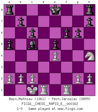 Last move : 1-0 2016 February 5 21:21:31 [Event "FICGS__CHESS__RAPID_E__000162"] [Site "FICGS"] [Date "2015.11.15"] [Round "1"] [White "Bain,Mathieu"] [Black "Pech,Jaroslav"] [Result "1-0"] [WhiteElo "1361"] [BlackElo "0899"] 1.e4 c6 2.d4 d5 3.Nc3 dxe4 4.Nxe4 Bf5 5.Bd3 Qxd4 6.Qf3 Bxe4 7.Qxe4 Qxe4+ 8.Bxe4 Nf6 9.f3 Nxe4 10.fxe4 e5 11.Nf3 f6 12.Bd2 Na6 13.O-O-O Nc5 14.Bb4 a5 15.Bxc5 Bxc5 16.Nh4 g6 17.Rhf1 1-0 Caro-Kann : Classical variation Queenside Castling by player White (move 13) Player White won this chess game. Follow this game move after move (download)Chess is above all, a fight ! (Emanuel Lasker) Ich verlor meine Bürgerrechte, mein Gehalt wurde mir nicht mehr bezahlt und ich wurde zensiert und durfte nicht mehr ins Ausland reisen. [nach dem Match Fischer-Taimanov 6:0] (Mark Taimanov) No solamente yo pronostico su triunfo sobre Botvinnik, sino que me adelanto y digo que probablemente Fischer es el jugador de Ajedrez mas grande que haya existido. (John Collins) Les Echecs ont trois composantes : le temps, l'espace et le matériel en dernier. (Mikhail Tal) It is a good thing for an uneducated man to read books of quotations. (Winston Churchill)
