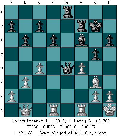 Last move : 1/2-1/2 2016 August 31 18:17:2 [Event "FICGS__CHESS__CLASS_A__000167"] [Site "FICGS"] [Date "2015.11.15"] [Round "1"] [White "Kolomytchenko,Igor"] [Black "Hamby,Stephen"] [Result "1/2-1/2"] [WhiteElo "2005"] [BlackElo "2170"] 1.d4 Nf6 2.c4 g6 3.Nc3 Bg7 4.Nf3 d6 5.e4 O-O 6.Be2 e5 7.O-O Nc6 8.Be3 Ng4 9.Bg5 f6 10.Bh4 g5 11.Bg3 f5 12.exf5 exd4 13.Nxd4 Nxd4 14.Bxg4 Bxf5 15.Bxf5 Nxf5 16.Qd5+ Rf7 17.Ne4 h6 18.Rad1 Qe8 19.b3 Qc6 20.Nf6+ Bxf6 21.Qxf5 Kg7 22.Qd3 Re8 23.f3 Qc5+ 24.Kh1 b6 25.f4 Qe3 26.Qb1 Qe4 1/2-1/2 King's Indian defense, 3.Nc3 Kingside Castling by player Black (move 5) Kingside Castling by player White (move 7) This chess game ended in a draw. Follow this game move after move (download)In order to improve your game, you must study the endgame before everything else, for whereas the endings can be studied and mastered by themselves, the middle game and the opening must be studied in relation to the endgame. (Jose Raul Capablanca) Zeige mir drei Eröffnungsvarianten und ich beweise dir, dass zwei davon inkorrekt sind. (Emanuel Lasker) Uno por uno, yo los acribillé, mi superioridad muy pronto se volvio aparente. (Jose Capablanca) Des combinaisons [dans le jeu d'échecs] pareilles à des mélodies. Je crois entendre pour ainsi dire la musique des coups... (Vladimir Nabokov) It is not true that people stop pursuing dreams because they grow old, they grow old because they stop pursuing dreams. (Gabriel Garcia Marquez)