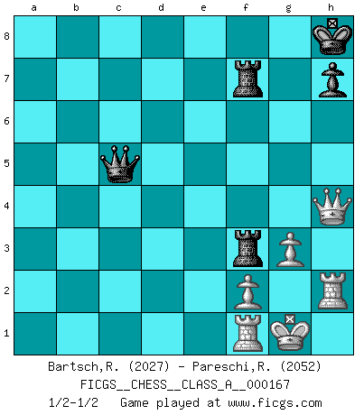 Last move : 1/2-1/2 2015 December 21 10:56:33 [Event "FICGS__CHESS__CLASS_A__000167"] [Site "FICGS"] [Date "2015.11.15"] [Round "1"] [White "Bartsch,Reinhard Andrea"] [Black "Pareschi,Remo"] [Result "1/2-1/2"] [WhiteElo "2027"] [BlackElo "2052"] 1.e4 g6 2.d4 Bg7 3.Nf3 d6 4.Nc3 Nf6 5.Be2 O-O 6.O-O Nc6 7.d5 Nb8 8.h3 c6 9.a4 Nbd7 10.Be3 Nc5 11.Nd2 e6 12.b4 Ncd7 13.dxe6 fxe6 14.Nb3 d5 15.exd5 cxd5 16.Qd2 Qe7 17.Rab1 Ne8 18.Bd4 Nd6 19.Bxg7 Qxg7 20.Nb5 Ne4 21.Qe3 Ndf6 22.Nxa7 Bd7 23.Nc5 Nxc5 24.bxc5 Bxa4 25.Nb5 Bxc2 26.Rb4 Ra4 27.Rb2 Re4 28.Qd2 Ba4 29.Nd6 Bc6 30.Bb5 Rh4 31.Bxc6 bxc6 32.Rb7 Qh6 33.Qb2 Ne4 34.Nxe4 Rxe4 35.Qb6 g5 36.Qxc6 g4 37.Rb3 Kh8 38.Qb6 gxh3 39.Rxh3 Qg5 40.Qb1 Qg7 41.c6 Rg4 42.g3 Rgf4 43.Kg2 Rf3 44.Qc2 d4 45.c7 Rc3 46.Qe4 Qxc7 47.Qxd4+ Qg7 48.Qe4 Rcf3 49.Qxe6 Qd4 50.Qe2 Qd5 51.Kg1 Qd4 52.Qe7 R8f7 53.Qh4 Qc5 54.Rh2 1/2-1/2 Robatsch (Modern) defense Kingside Castling by player Black (move 5) Kingside Castling by player White (move 6) This chess game ended in a draw. Follow this game move after move (download)First-class players lose to second-class players because second-class players sometimes play a first-class game. (Siegbert Tarrasch) Die westlichen Werte sind eine Sprache, welche die Putin-Administration nicht versteht. (Garry Kasparov) El Ajedrez es como la guerra en un tablero. (Bobby Fischer) Mais n'est-ce pas déjà le limiter injurieusement que d'appeler les échecs un jeu? N'est-ce pas aussi une science, un art, ou quelque chose qui, comme le cercueil de Mahomet entre ciel et terre, est suspendu entre l'un et l'autre, et qui réunit un nombre incroyable de contraires ? (Stefan Zweig) Computers are like Old Testament gods; lots of rules and no mercy. (Joseph Campbell)