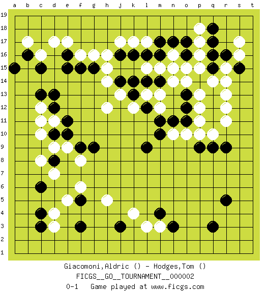 Last move : 0-1 2006 August 21 20:36:31 [Event "FICGS__GO__TOURNAMENT__000002"] [Site "FICGS"] [Date "2006.05.30"] [Round "1"] [Black "Giacomoni,Aldric"] [White "Hodges,Tom"] [Result "0-1"] 1.r16 d17 2.q3 d4 3.d10 p16 4.r5 k4 5.m4 m3 6.n3 l3 7.c6 c12 8.q18 p18 9.q13 r11 10.r9 p11 11.o13 l17 12.p9 r13 13.q12 r12 14.q11 q14 15.q15 r14 16.p14 s16 17.s15 r15 18.q16 s17 19.f3 e5 20.c3 d3 21.c4 c8 22.d8 c10 23.d12 d11 24.e11 c11 25.d13 d9 26.e10 e9 27.c15 c16 28.e15 f16 29.e16 e17 30.f15 g16 31.k16 k17 32.j16 j17 33.o16 p17 34.o17 p15 35.q17 o15 36.m17 o14 37.j3 h5 38.f5 f6 39.c13 d7 40.f9 f8 41.g9 h16 42.b16 b17 43.a15 h14 44.l9 q10 45.q9 p13 46.o12 p12 47.o11 o10 48.n11 n10 49.m10 p10 50.j14 j13 51.k14 h12 52.g15 h15 53.n15 n14 54.k13 k12 55.l12 l13 56.l14 m13 57.m14 m12 58.m11 m15 59.m16 l15 60.l16 n16 61.n17 n15 0-1 Here are the names of the openings (joseki) played in the four corners : Corner q16 : r16 p16 Komoku (Somok, Xiao~mu`) 3-4 Point. The komoku (3-4) point is the traditional corner enclosure move.. Ikken Takagakari (Hankan Nop'dakeolch'im, Yi Gaogua`jiao~, 1-Space High Approach). The 5-4 approach move has become more popular in modern times, as modern Go emphasizes speed and influence. Corner d4 : d4 c6 Hoshi (Hwajeom, Seongjeom, Xingwei`) 4-4 Point. The star or hoshi (4-4) point, emphasizing influence at the potential expense of territory. Ikken Kakari (Hankan Keolch'im, Yi Gua`jiao~, 1-Space Low Approach). Black 2 is the standard approach move to the 4-4. Player White won this Go (weiqi, baduk) game. Follow this game move after move (download)Keep inessential ataris till the end. (Anonymous) Wawaweewa ! (Borat: Cultural learnings of America for make benefit glorious nation of Kazakhstan)