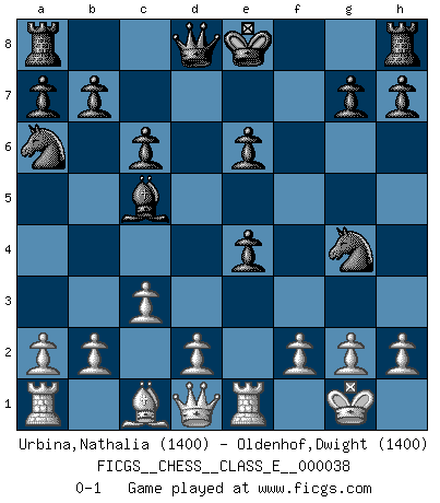 Last move : 0-1 2007 June 25 14:51:49 [Event "FICGS__CHESS__CLASS_E__000038"] [Site "FICGS"] [Date "2007.03.15"] [Round "1"] [White "Urbina,Nathalia"] [Black "Oldenhof,Dwight"] [Result "0-1"] [WhiteElo "1400"] [BlackElo "1400"] 1.e4 e5 2.Nf3 d5 3.Nxe5 dxe4 4.Bb5+ c6 5.Bc4 Be6 6.Bxe6 fxe6 7.Nc3 Nf6 8.O-O Bb4 9.Ne2 Na6 10.Nd4 Qxd4 11.Ng4 Bc5 12.c3 Qd8 13.Re1 Nxg4 0-1 This chess game has been lost on time (started : 2007.03.15 22:0:53) QP counter-gambit (elephant gambit) Kingside Castling by player White (move 8) Player Black won this chess game. Follow this game move after move (download)I know people who have all the will in the world, but still can't play good Chess. (Bobby Fischer) Wenn Spassky eine Figur opfert kannst du genauso gut aufgeben. Aber wenn Tal eine Figur opfert, spiel weiter. Er könnte noch eine weitere opfern, und dann ... wer weiß? (Miguel Najdorf) La batalla por la última verdad nunca sera ganada. Y es por eso que el Ajedrez es tan fascinante. (Hans Kmoch) Même un GMI sait rarement calculer sur plus de cinq coups une attaque à sacrifices. (Rudolf Spielmann) Luck is when opportunity knocks and you answer. (Anonymous)