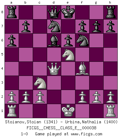 Last move : 1-0 2007 June 15 19:39:34 [Event "FICGS__CHESS__CLASS_E__000038"] [Site "FICGS"] [Date "2007.03.15"] [Round "1"] [White "Stoianov,Stoian"] [Black "Urbina,Nathalia"] [Result "1-0"] [WhiteElo "1341"] [BlackElo "1400"] 1.e4 c5 2.Nf3 d6 3.Bc4 Nf6 4.Nc3 e6 5.d3 Be7 6.Bb5+ Bd7 7.e5 Bxb5 8.Nxb5 dxe5 9.Nxe5 a6 10.Nc3 Bd6 11.Bf4 Nbd7 12.d4 cxd4 13.Qxd4 1-0 This chess game has been lost on time (started : 2007.03.15 22:0:53) Sicilian Player White won this chess game. Follow this game move after move (download)Chess is a sea in which a gnat may drink and an elephant may bathe. (Hindu proverb) Ich rechne überhaupt nicht voraus. Ich gewinne auch so. (Robert James Fischer) Muchos jugadores de Ajedrez se sorprendían cuando después de la partida, Fischer explicaba con calma: 'Yo ya había analizado esta posibilidad' en una posición en la cual yo creía que no era posible de prever desde la apertura. (Mikhail Tal) Psychologiquement, tu dois avoir confiance en toi même, mais cette confiance doit être basée sur des faits. (Robert Fischer) The best weapon against an enemy is another enemy. (Friedrich Nietzsche)