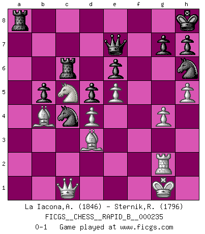 Last move : 0-1 2016 February 14 22:17:7 [Event "FICGS__CHESS__RAPID_B__000235"] [Site "FICGS"] [Date "2015.11.17"] [Round "1"] [White "La Iacona,Alessandro"] [Black "Sternik,Ryszard"] [Result "0-1"] [WhiteElo "1846"] [BlackElo "1796"] 1.e4 e6 2.d4 d5 3.e5 c5 4.c3 Nc6 5.Nf3 Qb6 6.a3 Bd7 7.b4 cxd4 8.cxd4 Rc8 9.Bb2 Nge7 10.Nc3 Na5 11.Na4 Qc6 12.Nc5 Nc4 13.Bc3 Ng6 14.h4 b6 15.Nxd7 Qxd7 16.h5 Ne7 17.Be2 Nf5 18.Qc2 Be7 19.Qb3 O-O 20.a4 Rc7 21.Rc1 b5 22.a5 Rfc8 23.O-O a6 24.Rfd1 Rc6 25.Rd3 Qc7 26.Qb1 Nxa5 27.g4 Nh6 28.Nd2 Nc4 29.Nb3 Bg5 30.Nc5 Bxc1 31.Qxc1 a5 32.Rg3 axb4 33.Bxb4 Ra8 34.Bd3 Qd8 35.Rg2 Qh4 36.f3 f5 37.Be1 Qe7 38.Bb4 fxg4 39.fxg4 Kh8 0-1 French : Advance, Paulsen attack Kingside Castling by player Black (move 19) Kingside Castling by player White (move 23) Player Black won this chess game. Follow this game move after move (download)Methodical thinking is of more use in Chess than inspiration. (C. J. S. Purdy) Schach wird sich dank seiner hohen kulturellen Tradition immer durchsetzen. In näherer Zukunft womöglich sogar als Gegenreaktion auf die maßlose Reizüberflutung im Freizeit- und Spielbereich. (Garry Kasparov) En el Ajedrez, tal como en la vida, las bendiciones de hoy pueden ser el veneno del mañana. (Assaic) Je fais ceci parce que dans cinquante coups j'obtiendrai cela; je m'appelle Mikhail Moisevitch Botvinnik. (Botvinnik) The meaning of life is that it is to be lived, and it is not to be traded and conceptualized and squeezed into a pattern of systems. (Bruce Lee)