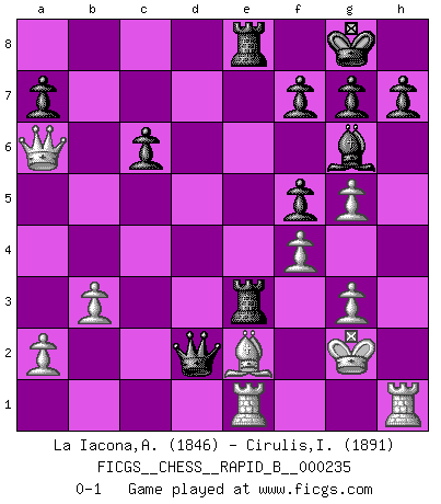 Last move : 0-1 2016 January 15 13:21:49 [Event "FICGS__CHESS__RAPID_B__000235"] [Site "FICGS"] [Date "2015.11.17"] [Round "1"] [White "La Iacona,Alessandro"] [Black "Cirulis,Ilmars"] [Result "0-1"] [WhiteElo "1846"] [BlackElo "1891"] 1.e4 c6 2.d4 d5 3.Nc3 dxe4 4.Nxe4 Nf6 5.Nxf6+ exf6 6.c3 Bf5 7.Ne2 Bd6 8.Ng3 Bxg3 9.hxg3 O-O 10.Be2 Na6 11.Qb3 Re8 12.Be3 Nc7 13.Kf1 b5 14.Re1 Nd5 15.Bd2 Re6 16.g4 Bg6 17.f4 f5 18.g5 Qd6 19.Qa3 b4 20.Qa5 Ne3+ 21.Bxe3 Rxe3 22.Rh4 Rae8 23.cxb4 Qxd4 24.Qa6 Qe4 25.Kf2 Qxb4 26.b3 R3e4 27.g3 Re3 28.R4h1 Qd4 29.Kg2 Qd2 0-1 Caro-Kann : Tartakower (Nimzovich) variation Kingside Castling by player Black (move 9) Player Black won this chess game. Follow this game move after move (download)You can only get good at Chess if you love the game. (Bobby Fischer) Ich kenne Menschen, die allen Willen der Welt besitzen und doch nicht Schach spielen können. (Robert James Fischer) Aún deseo matar a Fischer. (Boris Spassky) Comme les marins qui ont mille raisons différentes d'aller en mer, les joueurs d'échecs en ont tout autant avant de s'installer devant une table et jouer... (Vincent Bertignac, philosophe) Art disturbs, science reassures. (Georges Braque, Le Jour et la Nuit)