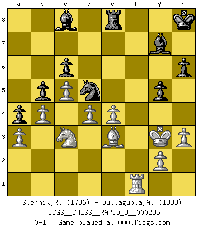 Last move : 0-1 2016 January 18 21:22:3 [Event "FICGS__CHESS__RAPID_B__000235"] [Site "FICGS"] [Date "2015.11.17"] [Round "1"] [White "Sternik,Ryszard"] [Black "Duttagupta,Aniruddha"] [Result "0-1"] [WhiteElo "1796"] [BlackElo "1889"] 1.d4 d5 2.Nf3 Nf6 3.c4 c6 4.e3 Bf5 5.Nc3 a6 6.Nh4 Bg4 7.Qb3 b5 8.h3 Bc8 9.c5 a5 10.Be2 Nbd7 11.O-O g6 12.a3 e5 13.Nf3 e4 14.Nd2 Bh6 15.Qc2 O-O 16.b3 Re8 17.Bb2 Ba6 18.b4 a4 19.Rfe1 Nf8 20.Nf1 N6d7 21.Ng3 f5 22.Bd1 Ne6 23.Bc1 Qh4 24.Nce2 Rf8 25.Bd2 Bg7 26.Rc1 Rae8 27.Qa2 Bc8 28.Bc2 Kh8 29.Rcd1 g5 30.Nc3 Bb7 31.Bc1 f4 32.Ngxe4 dxe4 33.Bxe4 Nf6 34.f3 Nc7 35.Qf2 Qxf2+ 36.Kxf2 fxe3+ 37.Kg3 Nxe4+ 38.fxe4 h6 39.Bxe3 Bc8 40.Rf1 Rxf1 41.Rxf1 Nd5 0-1 Queen's pawn game Kingside Castling by player White (move 11) Kingside Castling by player Black (move 15) Player Black won this chess game. Follow this game move after move (download)A strong memory, concentration, imagination, and a strong will is required to become a great Chess player. (Bobby Fischer) Ja, jede Frau in Holland liebt mich bestimmt, und alle Männer hassen mich. (Loek van Wely) Debió haber existido una vez en que los hombres eran semidióses, de otra manera no hubiesen podido inventar el Ajedrez. (Gustav Schenk) On peut tirer plus d'utilité d'une partie perdue que de 100 parties gagnées. (Capablanca) If only faces could talk... (Pat Summerall, Sportscaster during the Super Bowl)