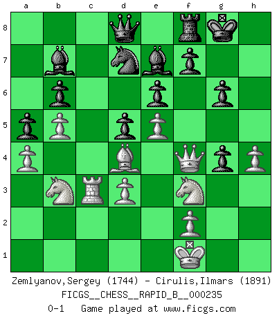 Last move : 0-1 2016 February 23 15:56:54 [Event "FICGS__CHESS__RAPID_B__000235"] [Site "FICGS"] [Date "2015.11.17"] [Round "1"] [White "Zemlyanov,Sergey"] [Black "Cirulis,Ilmars"] [Result "0-1"] [WhiteElo "1744"] [BlackElo "1891"] 1.e4 c6 2.d4 d5 3.e5 c5 4.dxc5 e6 5.a3 Bxc5 6.b4 Bf8 7.Bb2 a5 8.b5 Nd7 9.Nf3 Ne7 10.Nbd2 Nc5 11.a4 b6 12.Bd3 Bb7 13.O-O Ng6 14.Nb3 Nxd3 15.cxd3 Bb4 16.Bd4 Nf8 17.Ne1 Be7 18.Qg4 g6 19.h4 h5 20.Qf4 Nd7 21.Nf3 Rc8 22.Rfc1 Rxc1+ 23.Rxc1 O-O 24.Kf1 Ba3 25.Rc3 Be7 26.g4 hxg4 0-1 This chess game has been lost on time (started : 2015.11.17 14:14:17) Caro-Kann : Advance variation Kingside Castling by player White (move 13) Kingside Castling by player Black (move 23) Player Black won this chess game. Follow this game move after move (download)Fischer is an American Chess tragedy on par with Morphy and Pillsbury. (Mig Greengard) Du musst nicht gut spielen, es reicht, wenn du besser spielst als dein Gegner. (Anonymous) Vive, pierde y aprende al observar a tu oponente como gana. (Amber Steenbock) Les Echecs sont affaire de jugement sensible. Savoir quand frapper et quand esquiver. (Fischer) In theory there is no difference between theory and practice. In practice there is. (Yogi Berra)