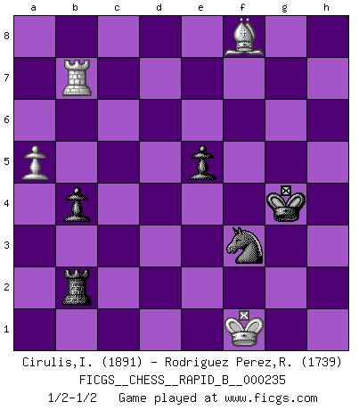 Last move : 1/2-1/2 2016 January 20 23:38:40 [Event "FICGS__CHESS__RAPID_B__000235"] [Site "FICGS"] [Date "2015.11.17"] [Round "1"] [White "Cirulis,Ilmars"] [Black "Rodriguez Perez,Rene"] [Result "1/2-1/2"] [WhiteElo "1891"] [BlackElo "1739"] 1.b4 Nf6 2.a3 e6 3.e3 c6 4.Bb2 d5 5.c4 dxc4 6.Bxc4 b5 7.Be2 a5 8.bxa5 Qxa5 9.Nf3 Nbd7 10.O-O Be7 11.d4 O-O 12.Nc3 Bb7 13.Qb3 Rfd8 14.Rfb1 h6 15.Bc1 Ne8 16.Bd2 Qc7 17.Ne4 c5 18.Nxc5 Bxc5 19.Rc1 Qb6 20.dxc5 Nxc5 21.Qc3 Rd5 22.Be1 Nd6 23.Rab1 Qd8 24.Nd4 Qg5 25.Bf1 Rc8 26.Qa1 Ra8 27.Bb4 Rc8 28.Rb2 Nce4 29.Rxc8+ Bxc8 30.Rc2 Bd7 31.Qe1 Nf5 32.Nc6 Bxc6 33.Rxc6 Nh4 34.Qe2 Nd2 35.f4 Qg6 36.e4 Rd4 37.f5 Qg5 38.fxe6 fxe6 39.Rc3 Nxf1 40.Kxf1 Qe5 41.Kg1 Rxe4 42.Qd3 Kh7 43.Bd6 Qd4+ 44.Qxd4 Rxd4 45.Bb4 Rd2 46.g3 Nf5 47.Rc7 Rb2 48.Rb7 Nd4 49.h3 Kg6 50.Bf8 e5 51.Bxg7 h5 52.g4 hxg4 53.hxg4 Nf3+ 54.Kf1 Kg5 55.a4 b4 56.a5 Kxg4 57.Bf8 1/2-1/2 Polish (Sokolsky) opening Kingside Castling by player White (move 10) Kingside Castling by player Black (move 11) 10 pieces endgame at move 53 : White KRBPP , Black KRNPP WHITE : King + 1 Rook 1 Bishop 2 Pawns BLACK : King + 1 Rook 1 Knight 2 Pawns 9 pieces endgame at move 56 : White KRBP , Black KRNPP WHITE : King + 1 Rook 1 Bishop 1 Pawn BLACK : King + 1 Rook 1 Knight 2 Pawns This chess game ended in a draw. Follow this game move after move (download)The King is a fighting piece. Use it ! (Wilhelm Steinitz) Ein Großmeister muß tausende Partien in seinem Kopf speichern, denn diese sind für Ihn, was die Worte der Muttersprache für gewöhnliche Leute sind, oder Noten für Musiker... (Garry Kasparov) Aún el Rey más flojo huye despavorido ante la amenaza de un Jaque doble. (Aaron Nimzowitsch) Donnez-moi un Cavalier en 6e et je gagnerais toutes mes parties. (Steinitz) There are more things in heaven and earth than practically anywhere else. (Unknown)