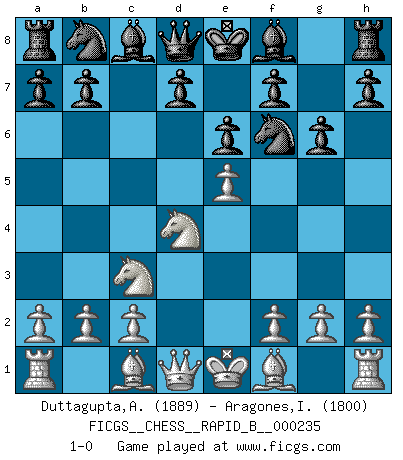Last move : 1-0 2015 December 23 9:28:17 [Event "FICGS__CHESS__RAPID_B__000235"] [Site "FICGS"] [Date "2015.11.17"] [Round "1"] [White "Duttagupta,Aniruddha"] [Black "Aragones,Inti"] [Result "1-0"] [WhiteElo "1889"] [BlackElo "1800"] 1.e4 c5 2.Nf3 e6 3.d4 cxd4 4.Nxd4 Nf6 5.Nc3 g6 6.e5 1-0 This chess game has been lost on time (started : 2015.11.17 14:14:17) Sicilian : Anderssen variation Player White won this chess game. Follow this game move after move (download)We don't really know how the game was invented, though there are suspicions. As soon as we discover the culprits, we'll let you know. (Bruce Pandolfini) Bobby Fischer ist kein Vorbild für die heutige Jugend. (Viktor Kortschnoi) El Ajedrez demanda una total concentración. (Bobby Fischer) Il vaut toujours mieux jouer un plan faux de façon logique que de n'avoir pas de plan du tout. (Victor Kortchnoï) When you stop learning you start dying. (M. Scott Adams)