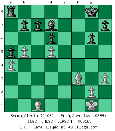 Last move : 1-0 2016 July 2 0:29:23 [Event "FICGS__CHESS__CLASS_F__000169"] [Site "FICGS"] [Date "2015.11.18"] [Round "1"] [White "Bromo,Alexis"] [Black "Pech,Jaroslav"] [Result "1-0"] [WhiteElo "1109"] [BlackElo "0899"] 1.d4 f5 2.c4 Nf6 3.Nc3 g6 4.Nf3 d6 5.b4 a5 6.b5 Bg7 7.e3 Nbd7 8.a4 e5 9.Be2 Ne4 10.Nxe4 fxe4 11.Nd2 exd4 12.exd4 Bxd4 13.Ra3 Qe7 14.O-O O-O 15.h3 Bc5 16.Rg3 Qe5 17.Nb3 Qxg3 18.Qd5+ Rf7 19.Nxc5 Qe5 20.Nxd7 Qxd5 21.cxd5 Bxd7 22.f3 exf3 23.Rxf3 Rxf3 24.Bxf3 1-0 This chess game has been lost on time (started : 2015.11.18 21:8:54) Dutch with c4 & Nc3 Kingside Castling by player White (move 14) Kingside Castling by player Black (move 14) Player White won this chess game. Follow this game move after move (download)Bobby is the most misunderstood, misquoted celebrity walking the face of this earth. (Yasser Seirawan) Ich hatte Angst gegen einen russischen Großmeister zu verlieren, und er befürchtete gegen einen kleinen Jungen zu verlieren. (über ein Remis gegen Juri Awerbach). (Robert James Fischer) El Ajedrez es el gimnasio de la mente. (Blaise Pascal) Le pion, dans sa simplicité, marche droit devant lui, mais lorsqu'il prend, il le fait obliquement? Ainsi l'homme, tant qu'il reste pauvre, marche dans la droiture et vit honnêtement, mais lorsqu'il recherche les honneurs, il flatte, se parjure et, par les voies obliques, cherche une position supérieure sur l'échiquier du monde. (Jean de Galles) I take risks, sometimes patients die, but not taking risks causes more patients to die. So I guess my biggest problem is I've been cursed with the ability to do the math. (Gregory House, House M.D.)