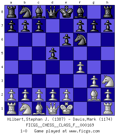 Last move : 1-0 2016 January 1 10:27:0 [Event "FICGS__CHESS__CLASS_F__000169"] [Site "FICGS"] [Date "2015.11.18"] [Round "1"] [White "Hilbert,Stephan J."] [Black "Davis,Mark"] [Result "1-0"] [WhiteElo "1387"] [BlackElo "1174"] 1.Nh3 d5 2.g3 Nf6 3.Bg2 e6 4.f4 1-0 This chess game has been lost on time (started : 2015.11.18 21:8:54) Amar (Paris) Opening Player White won this chess game. Follow this game move after move (download)The tactician knows what to do when there is something to do; whereas the strategian knows what to do when there is nothing to do. (Gerald Abrahams) Der Bart als Geschlechtszeichen mitten im Gesicht ist obszön. Daher gefällt er den Weibern. [Zugegeben, kein Schachzitat, aber unglaublich originell] (Arthur Schopenhauer) Algunos sacrificios son sólidos, los demás son míos. (Mikhail Tal) Les Cavaliers se révèlent fort utiles dans les positions fermées. D'habitude, les Fous sont un peu plus forts que les Cavaliers dans les positions ouvertes. Qu'on le veuille ou non, il restera toujours des exceptions ! You lose, general Kenobi. (General Grievous in Star Wars ep.3)