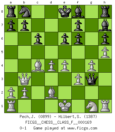Last move : 0-1 2016 March 14 6:25:43 [Event "FICGS__CHESS__CLASS_F__000169"] [Site "FICGS"] [Date "2015.11.18"] [Round "1"] [White "Pech,Jaroslav"] [Black "Hilbert,Stephan J."] [Result "0-1"] [WhiteElo "0899"] [BlackElo "1387"] 1.c4 d5 2.cxd5 Qxd5 3.Nc3 Qa5 4.d4 Nf6 5.Bd2 c6 6.e3 Bg4 7.f3 Bh5 8.e4 e6 9.Nd5 Qd8 10.Nxf6+ gxf6 11.h4 h6 12.g4 Bg6 13.h5 Bh7 14.Qb3 Qc7 15.Bc4 Qg3+ 0-1 This chess game has been lost on time (started : 2015.11.18 21:8:54) English Opening Player Black won this chess game. Follow this game move after move (download)The game of Chess is not merely an idle amusement; several very valuable qualities of the mind are to be acquired and strengthened by it, so as to become habits ready on all occasions; for life is a kind of Chess. (Benjamin Franklin) Obendrein hat der FIDE-Präsident den Revolutionsführer Gaddafi zum »Großmeister« ernannt, am Ende der WM. Das ist lächerlich! (Joel Lautier) La belleza de un movimiento no se refleja solo en su apariencia, sino en el pensamiento detrás de él. (Siegbert Tarrasch) Il (Jacob Murray) ne joue pas pour le bon coup, mais pour le meilleur. (Eloi Relange) Control your own destiny or someone else will. (Jack Welch)