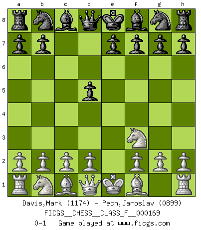 Last move : 0-1 2016 January 19 23:56:51 [Event "FICGS__CHESS__CLASS_F__000169"] [Site "FICGS"] [Date "2015.11.18"] [Round "1"] [White "Davis,Mark"] [Black "Pech,Jaroslav"] [Result "0-1"] [WhiteElo "1174"] [BlackElo "0899"] 1.e4 c6 2.Nf3 d5 3.exd5 cxd5 0-1 This chess game has been lost on time (started : 2015.11.18 21:8:54) Caro-Kann defense Player Black won this chess game. Follow this game move after move (download)No price is too great for the scalp of the enemy King. (Koblentz) Fallen sollten polizeilich verboten werden. (Savielly Grigorievitsch Tartakower) El Ajedrez, como cualquier otra actividad creativa, puede existir solo a través de méritos combinados de aquellos que tienen talento creativo y de aquellos que tienen la habilidad de organizar un trabajo creativo. (Mikhail Botvinnik) La vérité est comme le meilleur coup aux échecs : elle existe, mais il faut la chercher. (Arturo Perez-Reverte) The right perception of any matter and a misunderstanding of the same matter do not wholly exclude each other. (Kafka's the trial)
