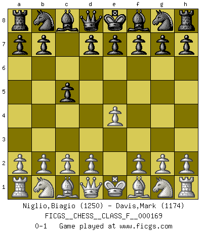 Last move : 0-1 2016 February 1 13:20:7 [Event "FICGS__CHESS__CLASS_F__000169"] [Site "FICGS"] [Date "2015.11.18"] [Round "1"] [White "Niglio,Biagio"] [Black "Davis,Mark"] [Result "0-1"] [WhiteElo "1250"] [BlackElo "1174"] 1.e4 c5 0-1 This chess game has been lost on time (started : 2015.11.18 21:8:54) Sicilian defense Player Black won this chess game. Follow this game move after move (download)If your opponent offers you a draw, try to work out why he thinks he's worse off. (Nigel Short) Wie, soll nun auch die Opposition abgeschafft werden? Ja, es tut mir leid, Ihnen diesen Schmerz nicht ersparen zu können. (Aaron Nimzowitsch) El Ajedrez es un cuento de Hadas de las 1001 metidas de pata. (Savielly Tartakower) La menace est plus forte que l'exécution. (Aaron Nimzovitch) Computers make it easier to do a lot of things, but most of the things they make it easier to do don't need to be done. (Andy Rooney)