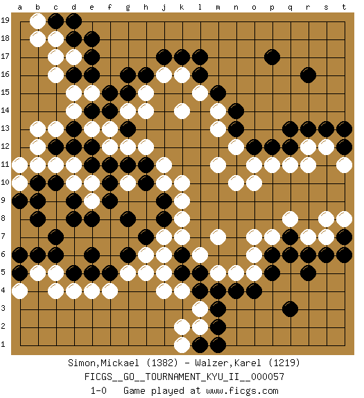 Last move : 1-0 2015 December 29 13:55:4 [Event "FICGS__GO__TOURNAMENT_KYU_II__000057"] [Site "FICGS"] [Date "2015.11.19"] [Round "1"] [Black "Simon,Mickael"] [White "Walzer,Karel"] [Result "1-0"] [Rating 1 "1382"] [Rating 2 "1219"] 1.r16 d4 2.q3 c16 3.e17 d15 4.k17 d11 5.r5 k4 6.p17 q11 7.r13 r12 8.q13 r7 9.m3 l3 10.m4 p7 11.c6 c8 12.d8 c9 13.d9 d10 14.e6 f4 15.c7 k10 16.g16 d17 17.e16 c5 18.d5 c4 19.f5 g5 20.g6 h5 21.g8 g10 22.o12 g14 23.f14 k14 24.d13 e13 25.e14 d14 26.e12 c13 27.d12 f13 28.c12 b13 29.c10 c11 30.g13 f12 31.f11 g12 32.g11 h12 33.e11 b12 34.h10 m7 35.b10 b11 36.b9 j11 37.f10 o11 38.q12 r11 39.n11 o10 40.n13 n10 41.m15 m11 42.p5 j7 43.b6 b5 44.g15 h14 45.m2 l2 46.l1 k1 47.m1 k2 48.s13 s12 49.s6 s7 50.t7 t8 51.t6 s8 52.d18 c18 53.d16 c17 54.e18 a10 55.b8 e15 56.f15 k16 57.l16 j16 58.j17 l15 59.l17 m14 60.n14 m13 61.t12 t11 62.t13 n12 63.p12 p11 64.j8 k8 65.j9 k9 66.h7 e4 67.e5 e10 68.f9 e9 69.e8 j10 70.h11 j6 71.c19 b19 72.d19 b18 73.q6 o6 74.h16 h15 75.l5 l6 76.k5 j5 77.q7 q8 78.p6 o7 79.l4 j4 80.a9 a11 81.r6 o5 82.o4 n5 83.n4 m5 84.k6 k7 85.a5 a4 86.a6 h6 87.pass 1-0 Here are the names of the openings (joseki) played in the four corners : Corner d16 : c16 e17 Komoku (Somok, Xiao~mu`) 3-4 Point. The komoku (3-4) point is the traditional corner enclosure move.. Ikken Kakari (Hankan Keolch'im, Yi Gua`jiao~, 1-Space Low Pincer). The small knight move is the basic approach move to the 3-4 point stone. It has been continually used for over four centuries. There are limitless variations, with new moves constantly being discovered. Black 2 opens the door to a treaure store of joseki. Corner d4 : d4 c6 Hoshi (Hwajeom, Seongjeom, Xingwei`) 4-4 Point. The star or hoshi (4-4) point, emphasizing influence at the potential expense of territory. Ikken Kakari (Hankan Keolch'im, Yi Gua`jiao~, 1-Space Low Approach). Black 2 is the standard approach move to the 4-4. Player Black won this Go (weiqi, baduk) game. Follow this game move after move (download)Five groups might live but the six will die. (Anonymous) As the days dwindle down... to a precious few. (Maxwell Anderson)