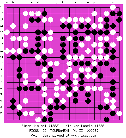 Last move : 0-1 2016 January 15 9:50:58 [Event "FICGS__GO__TOURNAMENT_KYU_II__000057"] [Site "FICGS"] [Date "2015.11.19"] [Round "1"] [Black "Simon,Mickael"] [White "Kis-Kos,Laszlo"] [Result "0-1"] [Rating 1 "1382"] [Rating 2 "1628"] 1.r16 d4 2.q3 d16 3.p17 r5 4.q8 q6 5.o4 s3 6.k3 q11 7.r13 q13 8.r12 q12 9.s9 r11 10.s11 r14 11.s14 q14 12.c6 g3 13.f17 h17 14.f15 d14 15.f13 l17 16.d12 d18 17.c9 s15 18.s16 s13 19.b4 c3 20.b3 g5 21.c13 c14 22.r10 o6 23.m4 o8 24.s12 t14 25.s7 g14 26.f14 d13 27.b13 b14 28.e12 h12 29.o15 n17 30.g15 h15 31.p9 p16 32.o16 o17 33.p15 q16 34.q15 q17 35.r15 n13 36.r17 p18 37.m15 h14 38.o13 o12 39.n14 p13 40.m13 o14 41.m12 l14 42.m14 o9 43.o10 n11 44.n10 m11 45.k12 p10 46.q10 p11 47.m10 l11 48.k13 l9 49.k14 r18 50.k16 k17 51.s18 s19 52.k11 l10 53.a14 a15 54.a13 b16 55.h2 g2 56.g1 f1 57.h1 e2 58.h3 h4 59.j4 j5 60.k5 j6 61.h8 j10 62.t17 d8 63.e6 f7 64.f6 g6 65.c8 d7 66.d6 g8 67.h9 c12 68.c11 b12 69.b11 a12 70.s5 r4 71.r3 s4 72.s6 p8 73.l7 k8 74.k7 j7 75.g10 f11 76.g11 g12 77.f12 g9 78.n16 m16 79.t18 k6 80.l6 l5 81.m5 k4 82.j3 m6 83.n6 m7 84.n7 m8 85.n8 n9 86.o5 p6 87.l16 m17 88.c2 d2 89.f10 h10 90.s2 t2 91.r1 f18 92.g18 g17 93.e17 e18 0-1 Here are the names of the openings (joseki) played in the four corners : Corner q4 : q3 r5 Komoku (Somok, Xiao~mu`) 3-4 Point. The komoku (3-4) point is the traditional corner enclosure move.. Ikken Kakari (Hankan Keolch'im, Yi Gua`jiao~, 1-Space Low Pincer). The small knight move is the basic approach move to the 3-4 point stone. It has been continually used for over four centuries. There are limitless variations, with new moves constantly being discovered. White 2 opens the door to a treaure store of joseki. Corner d4 : d4 c6 Hoshi (Hwajeom, Seongjeom, Xingwei`) 4-4 Point. The star or hoshi (4-4) point, emphasizing influence at the potential expense of territory. Ikken Kakari (Hankan Keolch'im, Yi Gua`jiao~, 1-Space Low Approach). Black 2 is the standard approach move to the 4-4. Corner d16 : d16 f17 Hoshi (Hwajeom, Seongjeom, Xingwei`) 4-4 Point. The star or hoshi (4-4) point, emphasizing influence at the potential expense of territory. Ikken Kakari (Hankan Keolch'im, Yi Gua`jiao~, 1-Space Low Approach). Black 2 is the standard approach move to the 4-4. Player White won this Go (weiqi, baduk) game. Follow this game move after move (download)On the second line six die, eight live. (Anonymous) When the going gets tactical, the computers get going. (Hyatt)