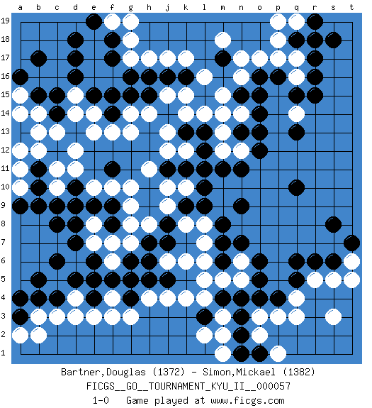 Last move : 1-0 2016 January 9 21:21:53 [Event "FICGS__GO__TOURNAMENT_KYU_II__000057"] [Site "FICGS"] [Date "2015.11.19"] [Round "1"] [Black "Bartner,Douglas"] [White "Simon,Mickael"] [Result "1-0"] [Rating 1 "1372"] [Rating 2 "1382"] 1.r16 d4 2.d17 q4 3.c15 p17 4.m17 q14 5.p16 q16 6.q15 q17 7.r15 n17 8.o16 o17 9.r17 n16 10.o14 h17 11.q13 k4 12.q6 o3 13.o6 c10 14.c6 f3 15.b4 c3 16.c8 c13 17.q10 m18 18.d9 l16 19.d10 e13 20.f15 r5 21.r6 d11 22.m4 m3 23.l3 l4 24.n3 m2 25.o4 p3 26.n2 m5 27.n4 l2 28.m7 k6 29.e6 m13 30.o12 s3 31.g5 h4 32.g4 g3 33.h5 j4 34.c12 d12 35.f11 b3 36.b5 k8 37.l9 b14 38.b15 g13 39.f17 r18 40.s18 s5 41.s6 g18 42.c14 b13 43.f18 h8 44.b10 c11 45.b9 f6 46.b11 b12 47.h15 j13 48.e5 f7 49.e4 e3 50.j16 j17 51.k16 k17 52.m11 e8 53.d8 e10 54.e9 f10 55.f9 g10 56.q18 p18 57.r19 e7 58.d7 g9 59.a3 a2 60.a4 b2 61.k11 n14 62.o15 t6 63.t7 t5 64.s8 f19 65.e19 g19 66.d18 n12 67.n11 o2 68.p4 g17 69.o1 p1 70.n1 q3 71.l13 l14 72.k13 k14 73.j14 j12 74.j11 m12 75.l11 g14 76.g15 a15 77.a16 a14 78.b17 h11 79.d5 h14 80.c4 m1 81.h7 g7 82.j7 l8 83.m8 n5 84.o5 e14 85.e15 d14 86.j8 j9 87.k9 l6 88.j5 j10 89.g6 j6 90.h6 d15 91.d16 n6 92.n7 k12 93.l12 k10 94.l10 p19 95.f8 g8 96.m6 l5 97.o13 d3 98.n15 m15 99.n13 m14 100.q5 j15 101.h16 q19 102.r18 k15 103.f14 f13 104.g16 a11 105.c9 a10 106.a9 a12 107.f5 l7 108.n9 f4 109.pass 1-0 Here are the names of the openings (joseki) played in the four corners : Corner q16 : r16 p17 Komoku (Somok, Xiao~mu`) 3-4 Point. The komoku (3-4) point is the traditional corner enclosure move.. Ikken Kakari (Hankan Keolch'im, Yi Gua`jiao~, 1-Space Low Pincer). The small knight move is the basic approach move to the 3-4 point stone. It has been continually used for over four centuries. There are limitless variations, with new moves constantly being discovered. White 2 opens the door to a treaure store of joseki. Corner q4 : q4 q6 Hoshi (Hwajeom, Seongjeom, Xingwei`) 4-4 Point. The star or hoshi (4-4) point, emphasizing influence at the potential expense of territory. Ikken Takagakari (Hankan Nop'dakeolch'im, Yi Gaojia, 1-Space High Approach). White typically responds at 6-4 or 3-10. White 4-10 is played when White finds play on the right side advantageous. White 4-8 or 3-8 may be played when White has support at top. Corner d4 : d4 c6 Hoshi (Hwajeom, Seongjeom, Xingwei`) 4-4 Point. The star or hoshi (4-4) point, emphasizing influence at the potential expense of territory. Ikken Kakari (Hankan Keolch'im, Yi Gua`jiao~, 1-Space Low Approach). Black 2 is the standard approach move to the 4-4. Player Black won this Go (weiqi, baduk) game. Follow this game move after move (download)Empty triangles are bad. (Anonymous) The Internet is the first thing that humanity has build that humanity doesn't understand, the largest experiment in anarchy that we have ever had. (Eric Schmidt)