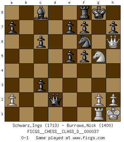 Last move : 0-1 2007 May 17 7:21:12 [Event "FICGS__CHESS__CLASS_D__000037"] [Site "FICGS"] [Date "2007.03.15"] [Round "1"] [White "Schwarz,Ingo"] [Black "Burrows,Nick"] [Result "0-1"] [WhiteElo "1713"] [BlackElo "1400"] 1.e4 c5 2.f4 Nc6 3.Nf3 g6 4.Bb5 Bg7 5.Bxc6 bxc6 6.Nc3 d6 7.O-O Nf6 8.d3 Rb8 9.Qe1 O-O 10.f5 gxf5 11.Qh4 c4 12.Bh6 Bxh6 13.Qxh6 Rxb2 14.Ng5 Rxc2 15.e5 dxe5 16.Nd1 Qd4+ 17.Nf2 Rxf2 18.Kh1 Rxf1+ 19.Rxf1 Qxd3 20.Re1 Qd2 21.Rg1 c3 0-1 Sicilian : Grand Prix attack Kingside Castling by player White (move 7) Kingside Castling by player Black (move 9) Player Black won this chess game. Follow this game move after move (download)The isolated Pawn casts gloom over the entire chessboard. (Aaron Nimzovich) Du kannst im Schach nur gut werden, wenn du das Spiel liebst. (Robert James Fischer) Fischer era un maestro de claridad y un Rey del posicionamiento astuto. Sus oponentes podían ver hacia donde se dirigía pero eran impotentes para detenerlo. (Bruce Pandolfini) Horreur, mais aussi harmonie suprême : qu'y avait-il en effet au monde en dehors des échecs ? Le brouillard, l'inconnu, le non-être... (Vladimir Nabokov) It's unlucky to be superstitious. (Dave Enteles)
