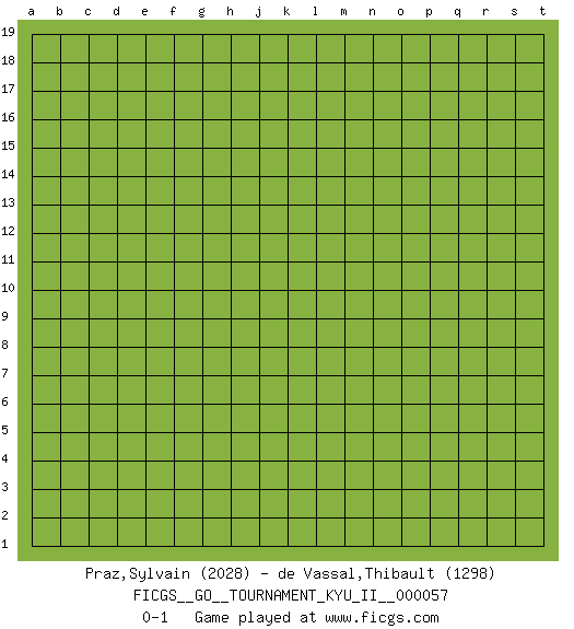 Last move : 0-1 2015 December 19 21:22:55 [Event "FICGS__GO__TOURNAMENT_KYU_II__000057"] [Site "FICGS"] [Date "2015.11.19"] [Round "1"] [Black "Praz,Sylvain"] [White "de Vassal,Thibault"] [Result "0-1"] [Rating 1 "2028"] [Rating 2 "1298"] 0-1 This go game has been lost on time (started : 2015.11.19 15:32:10) Here are the names of the openings (joseki) played in the four corners : Player White won this Go (weiqi, baduk) game. Follow this game move after move (download)Grab the border points between two moyos. (Anonymous) Employ the attack like tactic of defense. (Chinese proverb)