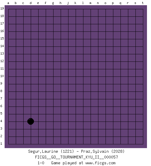 Last move : 1-0 2016 January 6 10:43:19 [Event "FICGS__GO__TOURNAMENT_KYU_II__000057"] [Site "FICGS"] [Date "2015.11.19"] [Round "1"] [Black "Segur,Laurine"] [White "Praz,Sylvain"] [Result "1-0"] [Rating 1 "1221"] [Rating 2 "2028"] 1.d4 1-0 This go game has been lost on time (started : 2015.11.19 15:32:10) Here are the names of the openings (joseki) played in the four corners : Corner d4 : d4 1-0 Hoshi (Hwajeom, Seongjeom, Xingwei`) 4-4 Point. The star or hoshi (4-4) point, emphasizing influence at the potential expense of territory. Player Black won this Go (weiqi, baduk) game. Follow this game move after move (download)It is difficult to know exactly what you are doing. (Pierre Audouard) Beep ! (R2D2 in Star Wars ep.3)
