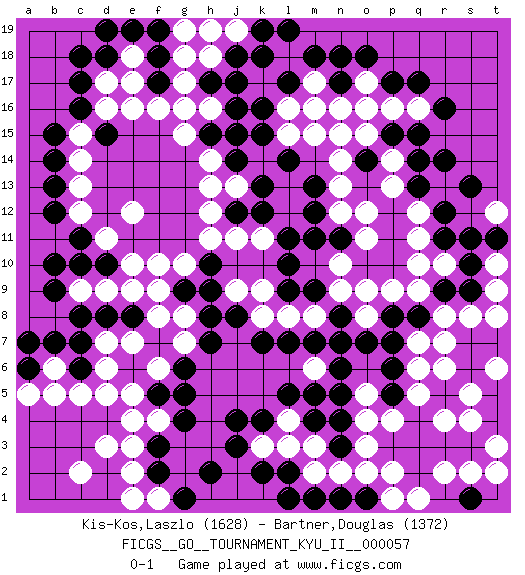 Last move : 0-1 2016 February 15 20:39:7 [Event "FICGS__GO__TOURNAMENT_KYU_II__000057"] [Site "FICGS"] [Date "2015.11.19"] [Round "1"] [Black "Kis-Kos,Laszlo"] [White "Bartner,Douglas"] [Result "0-1"] [Rating 1 "1628"] [Rating 2 "1372"] 1.r16 d16 2.q3 d3 3.p17 q5 4.q8 o4 5.p5 p4 6.q4 q6 7.n5 m3 8.p6 q7 9.p7 r8 10.r9 q9 11.p8 r7 12.s9 r4 13.r3 s4 14.s3 s5 15.s7 s8 16.s6 t6 17.t7 t8 18.t5 r6 19.k4 l4 20.l5 k3 21.m4 l3 22.j4 p2 23.p3 o3 24.q2 o2 25.s1 t2 26.j3 d5 27.k2 s2 28.t4 t6 29.l2 m2 30.c7 d7 31.d8 e7 32.c6 e5 33.c11 q10 34.r11 q11 35.r12 q12 36.q13 o12 37.f17 c14 38.k16 n13 39.m12 r10 40.s10 n15 41.o14 n14 42.l14 r13 43.s13 p13 44.q14 p14 45.q15 o16 46.n17 o17 47.o18 n10 48.c17 d17 49.d18 e18 50.c18 e17 51.b15 c15 52.c16 f16 53.b14 c13 54.e8 c5 55.f3 p16 56.q17 e12 57.b13 c12 58.b12 d11 59.c10 g16 60.h17 h16 61.j16 h13 62.f18 g17 63.e19 g18 64.f19 g19 65.d19 t9 66.s11 m17 67.m18 n16 68.n18 l16 69.l17 l15 70.k12 j11 71.j14 h14 72.j18 m6 73.m5 o5 74.n6 f10 75.n8 o9 76.d15 e16 77.l10 k11 78.l11 g8 79.f7 f8 80.g6 k9 81.m9 p9 82.m16 b5 83.b7 e2 84.f2 c2 85.j12 h12 86.h9 j9 87.h8 g10 88.h10 h11 89.k7 l8 90.l7 m8 91.m7 m15 92.k15 g7 93.h7 f6 94.g5 h18 95.j17 f1 96.g1 e1 97.h2 o8 98.o7 n9 99.n7 d9 100.c8 e9 101.n11 o11 102.l9 k8 103.a6 a5 104.m13 n12 105.m11 b6 106.a7 j13 107.k13 c9 108.b9 d6 109.b10 f4 110.g4 e3 111.f5 e4 112.p15 o15 113.d10 e10 114.m1 n2 115.n1 t3 116.o1 q1 117.h15 g15 118.j15 t10 119.t11 m17 120.j8 l18 121.m16 j19 122.k18 m17 123.l19 p1 124.l1 q16 125.g9 f9 126.m16 t12 127.r14 m17 128.n4 m16 129.n3 r2 130.k19 h19 131.pass pass 0-1 Here are the names of the openings (joseki) played in the four corners : Corner q4 : q3 q5 Komoku (Somok, Xiao~mu`) 3-4 Point. The komoku (3-4) point is the traditional corner enclosure move.. Ikken Takagakari (Hankan Nop'dakeolch'im, Yi Gaogua`jiao~, 1-Space High Approach). The 5-4 approach move has become more popular in modern times, as modern Go emphasizes speed and influence. Corner d4 : d3 j4 Komoku (Somok, Xiao~mu`) 3-4 Point. The komoku (3-4) point is the traditional corner enclosure move.. Corner d16 : d16 c11 Hoshi (Hwajeom, Seongjeom, Xingwei`) 4-4 Point. The star or hoshi (4-4) point, emphasizing influence at the potential expense of territory. Player White won this Go (weiqi, baduk) game. Follow this game move after move (download)The possibility or impossibility of an event results logically from the rules. (Pierre Audouard) A belief is an idea the mind possesses, an idea that possesses the mind. (Robert Oxden Bolton)