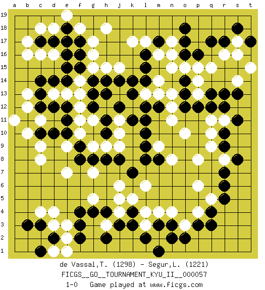 Last move : 1-0 2016 July 27 0:56:33 [Event "FICGS__GO__TOURNAMENT_KYU_II__000057"] [Site "FICGS"] [Date "2015.11.19"] [Round "1"] [Black "de Vassal,Thibault"] [White "Segur,Laurine"] [Result "1-0"] [Rating 1 "1298"] [Rating 2 "1221"] 1.q3 d16 2.q17 d4 3.r10 c8 4.f3 e3 5.f4 e2 6.f2 l4 7.k3 n4 8.r5 p4 9.p3 g17 10.k4 o3 11.o2 q5 12.q4 p6 13.r6 p8 14.c14 c11 15.e14 b16 16.g14 k17 17.m17 r16 18.r17 s16 19.r13 q15 20.o16 s17 21.s18 p14 22.p12 p13 23.o12 s14 24.s13 t15 25.t17 o15 26.l15 m14 27.l14 m13 28.l12 n16 29.o17 m16 30.l16 n12 31.m12 n11 32.o13 n13 33.o14 n15 34.q13 o10 35.l10 n17 36.p16 p15 37.o18 l17 38.e11 q10 39.r9 q11 40.q12 r11 41.s11 e7 42.f9 l6 43.l8 j6 44.n2 g7 45.h8 h3 46.h4 m2 47.m3 l3 48.l2 k5 49.c10 b10 50.b11 b12 51.c12 a11 52.d12 h15 53.j14 l13 54.k13 m9 55.m8 m4 56.m1 k12 57.l11 j13 58.k14 h12 59.h14 j10 60.l9 h9 61.j8 g9 62.g8 f10 63.e10 f11 64.h11 g11 65.h10 e9 66.f8 j9 67.k7 c9 68.d10 f13 69.e12 f12 70.g13 f14 71.f15 e13 72.d14 g15 73.e16 e17 74.f17 f18 75.f16 g16 76.e15 d13 77.c13 j15 78.k11 b13 79.d17 d18 80.c17 c16 81.e18 j11 82.j12 e19 83.e17 h18 84.h13 c18 85.g12 b17 86.r12 g5 87.g4 n8 88.c3 c4 89.d2 d1 90.c1 e1 91.b3 d3 92.n3 r8 93.s8 q9 94.r7 j4 95.j3 j5 96.h2 1-0 Here are the names of the openings (joseki) played in the four corners : Corner q4 : q3 l4 Komoku (Somok, Xiao~mu`) 3-4 Point. The komoku (3-4) point is the traditional corner enclosure move.. Player Black won this Go (weiqi, baduk) game. Follow this game move after move (download)Don't make dango's. (Anonymous) Memory... is the diary that we all carry with us. (Oscar Wilde, The Importance of Being Earnest)