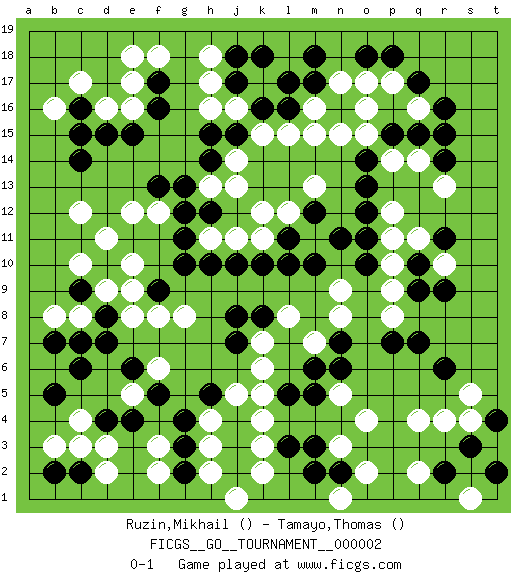Last move : 0-1 2006 June 20 6:54:47 [Event "FICGS__GO__TOURNAMENT__000002"] [Site "FICGS"] [Date "2006.05.30"] [Round "1"] [Black "Ruzin,Mikhail"] [White "Tamayo,Thomas"] [Result "0-1"] 1.q17 q4 2.d4 d16 3.r15 k17 4.m17 k15 5.q10 m15 6.l16 l15 7.k16 j16 8.j17 h17 9.j18 h18 10.j15 h16 11.k18 k12 12.d10 f3 13.c6 d2 14.r6 o4 15.m3 n5 16.j3 c3 17.c14 c8 18.d8 c12 19.c16 c17 20.d15 b16 21.c15 e16 22.e15 e12 23.f16 e17 24.f13 f12 25.f17 e18 26.g13 d11 27.h14 f18 28.g12 e10 29.g10 d9 30.c9 c10 31.c7 b8 32.b7 e8 33.d7 h11 34.g11 n3 35.k10 q11 36.o11 n17 37.n16 m16 38.l17 o16 39.o14 n15 40.m18 q16 41.r16 p14 42.o13 q14 43.r14 r13 44.p15 o15 45.q15 p12 46.o12 r10 47.r9 p10 48.q9 p11 49.o10 p9 50.r11 p8 51.q7 j14 52.h15 m11 53.m10 k11 54.l11 l12 55.l10 p17 56.o18 o17 57.p18 j13 58.p7 n8 59.n7 m7 60.n6 l8 61.k8 k7 62.j8 g8 63.f9 f8 64.j7 k6 65.h5 f6 66.f5 e5 67.e4 c4 68.e6 e9 69.l5 n9 70.m12 m13 71.n11 k5 72.m5 k3 73.l3 k2 74.j4 k4 75.n2 o2 76.m6 n1 77.m2 h2 78.j2 j1 79.g2 h3 80.g3 h4 81.g4 j5 82.j10 h13 83.h12 j11 84.h10 r4 85.b2 b3 86.c2 d3 87.b5 f2 88.s3 s4 89.r2 q2 90.t2 s1 91.t4 s5 0-1 Here are the names of the openings (joseki) played in the four corners : Corner d4 : d4 f3 Hoshi (Hwajeom, Seongjeom, Xingwei`) 4-4 Point. The star or hoshi (4-4) point, emphasizing influence at the potential expense of territory. Ikken Kakari (Hankan Keolch'im, Yi Gua`jiao~, 1-Space Low Approach). White 2 is the standard approach move to the 4-4. Corner q4 : q4 r6 Hoshi (Hwajeom, Seongjeom, Xingwei`) 4-4 Point. The star or hoshi (4-4) point, emphasizing influence at the potential expense of territory. Ikken Kakari (Hankan Keolch'im, Yi Gua`jiao~, 1-Space Low Approach). Black 2 is the standard approach move to the 4-4. Player White won this Go (weiqi, baduk) game. Follow this game move after move (download)Everything would seem to be possible in Go. Like pulling a rabbit, by a magical move, out of a hat. (Pierre Audouard) The bottom line is always the bottom line. (Johann Piek)