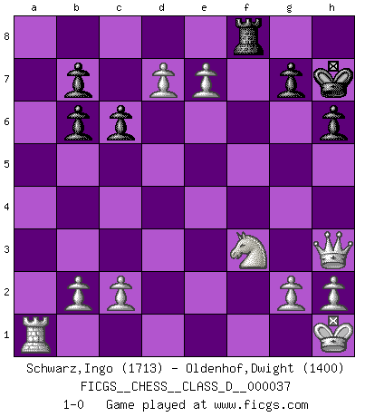 Last move : 1-0 2007 December 4 8:17:2 [Event "FICGS__CHESS__CLASS_D__000037"] [Site "FICGS"] [Date "2007.03.15"] [Round "1"] [White "Schwarz,Ingo"] [Black "Oldenhof,Dwight"] [Result "1-0"] [WhiteElo "1713"] [BlackElo "1400"] 1.e4 e5 2.Bc4 Nf6 3.d4 Nxe4 4.dxe5 Bc5 5.Bxf7+ Kxf7 6.Qd5+ Ke8 7.Qxe4 c6 8.Nf3 d5 9.exd6 Kf8 10.Qf4+ Ke8 11.Qe5+ Kf7 12.Qxc5 Re8+ 13.Ne5+ Kf6 14.f4 Nd7 15.Qc3 Nxe5 16.O-O Bf5 17.fxe5+ Ke6 18.Bf4 Qb6+ 19.Kh1 Be4 20.Nd2 Bd5 21.Qh3+ Kf7 22.Be3 Kg8 23.Bxb6 axb6 24.Nf3 Bxa2 25.d7 Re7 26.Rxa2 Rf8 27.Rfa1 h6 28.Ra8 Ref7 29.Rxf8+ Rxf8 30.e6 Kh7 31.e7 1-0 This chess game has been lost on time (started : 2007.03.15 23:12:25) Bishop's Opening : Ponziani gambit Kingside Castling by player White (move 16) Player White won this chess game. Follow this game move after move (download)Fischer sacrificed virtually everything most of us weakies (to use his term) value, respect, and cherish, for the sake of an artful, often beautiful board game, for the ambivalent privilege of being its greatest master. (Paul Kollar) Der Bart als Geschlechtszeichen mitten im Gesicht ist obszön. Daher gefällt er den Weibern. [Zugegeben, kein Schachzitat, aber unglaublich originell] (Arthur Schopenhauer) Cuando le juegas a Fischer, no es una cuestion de si vas a ganar o perder. Es una cuestion de si vas a sobrevivir. (Boris Spassky) Tous ces prétendus hommes politiques sont les pions, les Cavaliers, les Tours ou les Fous d'une partie d'échecs qui se jouera tant qu'un hasard ne renversera pas l'échiquier. (Honoré de Balzac) I'll be back. (Arnold Schwarzenegger)