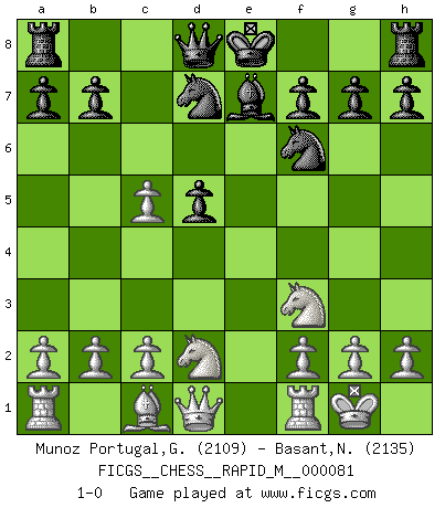 Last move : 1-0 2016 January 24 0:28:47 [Event "FICGS__CHESS__RAPID_M__000081"] [Site "FICGS"] [Date "2015.11.19"] [Round "1"] [White "Munoz Portugal,Guillermo"] [Black "Basant,Neel"] [Result "1-0"] [WhiteElo "2109"] [BlackElo "2135"] 1.e4 e6 2.d4 d5 3.Nd2 c5 4.Ngf3 Nf6 5.exd5 exd5 6.Bb5 Bd7 7.Bxd7 Nbxd7 8.O-O Be7 9.dxc5 1-0 This chess game has been lost on time (started : 2015.11.19 20:49:31) French : Tarrasch, Open variation Kingside Castling by player White (move 8) Player White won this chess game. Follow this game move after move (download)I am the best player in the world and I am here to prove it. (Bobby Fischer) Besser ein falscher Plan, logisch durchgeführt, als gar kein Plan. (Viktor Kortschnoi) Dios mío, Bobby Fischer juega tan simple. (Alexei Suetin) Les réformistes prétendent que les progrès de la théorie conduiront à la disparition des échecs, et qu'il faut, pour leur rendre vie, en remanier les règles. En réalité, qu'exprime cette affirmation? Le mépris de l'intuition, de l'imagination et de tous les autres éléments qui font des échecs un art. (Alexander Alekhine) Luck is when opportunity knocks and you answer. (Anonymous)