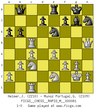 Last move : 1-0 2016 March 9 17:57:10 [Event "FICGS__CHESS__RAPID_M__000081"] [Site "FICGS"] [Date "2015.11.19"] [Round "1"] [White "Helmer,Janos"] [Black "Munoz Portugal,Guillermo"] [Result "1-0"] [WhiteElo "2210"] [BlackElo "2109"] 1.Nf3 Nf6 2.c4 c5 3.g3 b6 4.Bg2 Bb7 5.O-O g6 6.Nc3 Bg7 7.d4 cxd4 8.Qxd4 Na6 9.b3 Nc5 10.Be3 Qc7 11.Rac1 O-O 12.Qh4 Rac8 13.Rfd1 Qb8 14.Nd4 Bxg2 15.Kxg2 h5 16.Bg5 Rfe8 17.f3 a6 18.e4 Nh7 19.Nde2 Ne6 20.Bxe7 g5 21.Bxg5 Nexg5 22.Rd5 Rc5 23.Qxh5 Ne6 24.Rxc5 1-0 This chess game has been lost on time (started : 2015.11.19 20:49:31) Reti Opening Kingside Castling by player White (move 5) Kingside Castling by player Black (move 11) Player White won this chess game. Follow this game move after move (download)Strategy requires thought, tactics require observation. (Max Euwe) Im Spitzenschach von heute geht es nur um Vorbereitung, um tiefgründige, sorgfältige Eröffnungsvorbereitung. (Nigel Short) El Ajedrez es parte de una cultura y si una cultura esta en decadencia, entonces también el Ajedrez declinará. (Mikhail Botvinnik) Dieu déplace le joueur, et celui-ci la pièce. Quel Dieu derrière Dieu commence donc la trame ? Arturo Perez-Reverte (prix de littérature policière 1993). Only sick music makes money today. (Friedrich Nietzsche)
