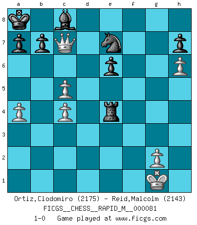 Last move : 1-0 2015 December 5 20:33:21 [Event "FICGS__CHESS__RAPID_M__000081"] [Site "FICGS"] [Date "2015.11.19"] [Round "1"] [White "Ortiz,Clodomiro"] [Black "Reid,Malcolm"] [Result "1-0"] [WhiteElo "2175"] [BlackElo "2143"] 1.d4 Nc6 2.d5 Ne5 3.f4 Ng6 4.Nc3 e6 5.dxe6 fxe6 6.h4 Bb4 7.h5 Bxc3+ 8.bxc3 N6e7 9.e4 Nc6 10.Nf3 Qe7 11.a4 d6 12.Bb5 Bd7 13.Qe2 O-O-O 14.Rb1 Kb8 15.e5 Nh6 16.Ba3 Nf5 17.Kf2 Ka8 18.Rhd1 g5 19.fxg5 Rdf8 20.Kg1 Rhg8 21.exd6 cxd6 22.Bd3 Qe8 23.Bxf5 Rxf5 24.Rxd6 Bc8 25.Qe4 Qf7 26.c4 Rf4 27.Qd3 Qc7 28.h6 Rf5 29.Rd1 Qb6+ 30.c5 Qc7 31.Re1 Rgf8 32.Re4 Ne7 33.Nd4 Rxg5 34.Nb5 Qb8 35.Bc1 Rd5 36.Rxd5 Nxd5 37.c4 Ne7 38.Bf4 Rxf4 39.Qd8 Rxe4 40.Nc7+ Qxc7 41.Qxc7 1-0 Queen's pawn : Lundin (Kevitz-Mikenas) defense Queenside Castling by player Black (move 13) Player White won this chess game. Follow this game move after move (download)Chess is a terrific way for kids to build self image and self esteem. (Saudin Robovic) Der vorletzte Fehler gewinnt. (Savielly Grigorievitsch Tartakower) Yo tuve un dolor de muelas en la primer partida. En el segundo juego, tuve un dolor de cabeza. En el tercero, tuve un ataque de reumatísmo. En la cuarta partida, no me sentía muy bien. ¿Y en el quinto juego? Bueno, ¿que acaso uno tiene que ganar todos los juegos?. (Siegbert Tarrasch) D'abord les bases : Jouez et étudiez, puis étudiez et jouez, ensuite jouez et étudiez, puis étudiez et jouez. Deuxièmement : Donnez toujours le meilleur de vous-même ! (Ken Smith) After growing wildly for years, the field of computing appears to be reaching its infancy. (John Pierce)