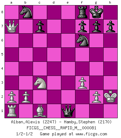 Last move : 1/2-1/2 2016 January 12 18:13:44 [Event "FICGS__CHESS__RAPID_M__000081"] [Site "FICGS"] [Date "2015.11.19"] [Round "1"] [White "Alban,Alexis"] [Black "Hamby,Stephen"] [Result "1/2-1/2"] [WhiteElo "2247"] [BlackElo "2170"] 1.e4 e6 2.d4 d5 3.exd5 exd5 4.c4 Nf6 5.Nc3 Bb4 6.Bd3 O-O 7.Nf3 Bg4 8.O-O dxc4 9.Bxc4 Bxf3 10.Qxf3 Qxd4 11.Qxb7 Qxc4 12.Qxa8 Bd6 13.Qxa7 Bxh2+ 14.Kxh2 Qxf1 15.f3 Qe1 1/2-1/2 French : Exchange variation Kingside Castling by player Black (move 6) Kingside Castling by player White (move 8) This chess game ended in a draw. Follow this game move after move (download)Chess is as much a mystery as women. (Purdy) Drei Punkte vor allen anderen ist wie einer, der im weißen Anzug posiert, während der Rest in Müllsäcke gekleidet dasteht. (Viktor Kortschnoi) ¿Se han dado cuenta de que Fischer casi nunca ha tenido piezas malas? El las intercambia y las piezas malas se quedan con sus oponenets. (Yuri Balashov) Les échecs sont un jeu par leur forme, un art par leur essence et une science par sa difficulté d'acquisition. Ils peuvent vous procurer autant de plaisir qu'un bon livre ou une belle musique, mais vous n'aurez une réelle joie que si vous arrivez à bien jouer. (Tigran Petrosian) Wisdom begins at the end. (Daniel Webster)